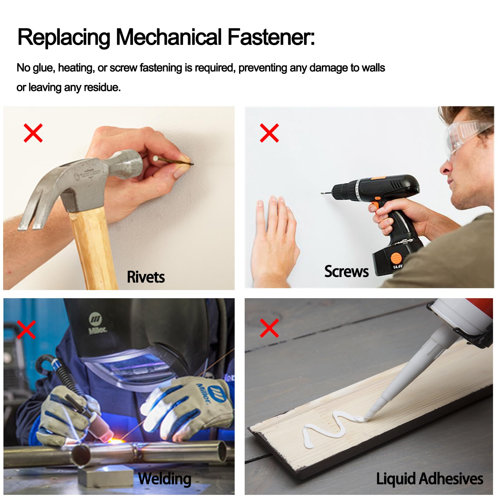 - 【No Damage to Walls Paint】The strong adhesive tape offers a quick and easy permanent bonding solution without damaging walls or paint. It replaces mechanical fasteners (such as rivets, welding, or screws) and liquid adhesives. No drilling, sanding, trimming, screwing, welding or cleanup needed
