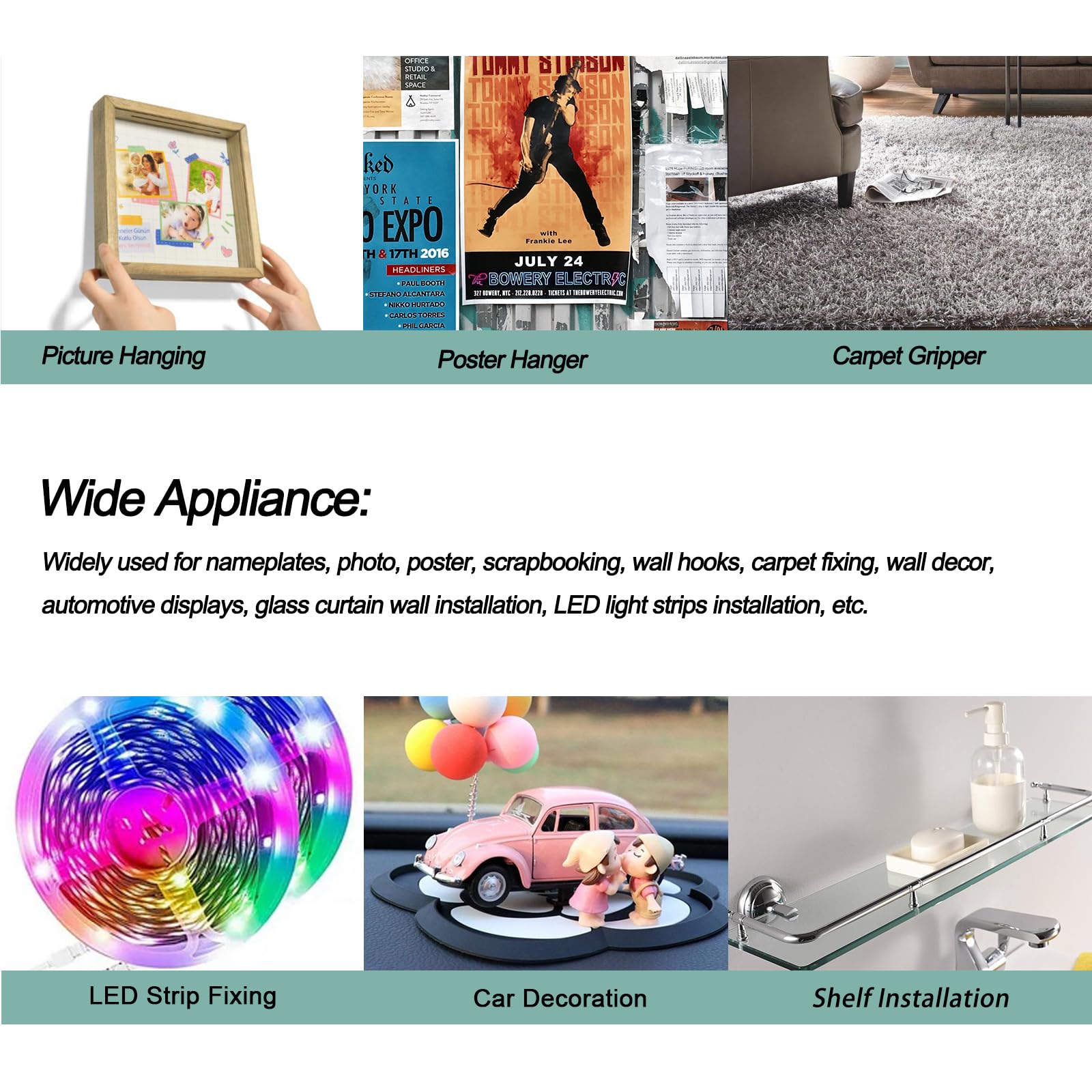 - 【Multipurpose Adhesive Tape】Widely used in home, appliances, automobiles, construction, transportation. such as signs, nameplates, photo, poster, scrapbooking, wall hooks, carpet fixing, wall decor, automotive displays, glass curtain wall installation, appliance panel adhesion, LED light strips installation, etc