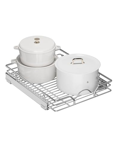 - Full Extension Slide Wire Basket:The pull-out cabinet organizer keeps lids, pots and pans, and other kitchenware tidy and arranged. A range of kitchen tools and supplies are easy to access owing to the pull-out design, which also efficiently maximizes storage space.