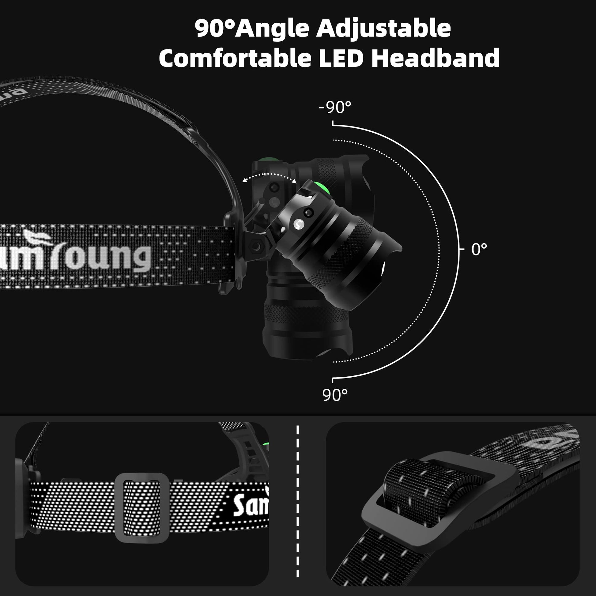 - 【90°Angle Adjustable & Comfortable Headband】 - Samyoung headlamp rechargeable can be adjusted 90°, the running headlamp gives you a comfortable lighting effect and the light source is very stable; At the same time, we are equipped with a comfortable and adjustable headband, which is very light and will not put pressure on your head, suitable for men, women and children.