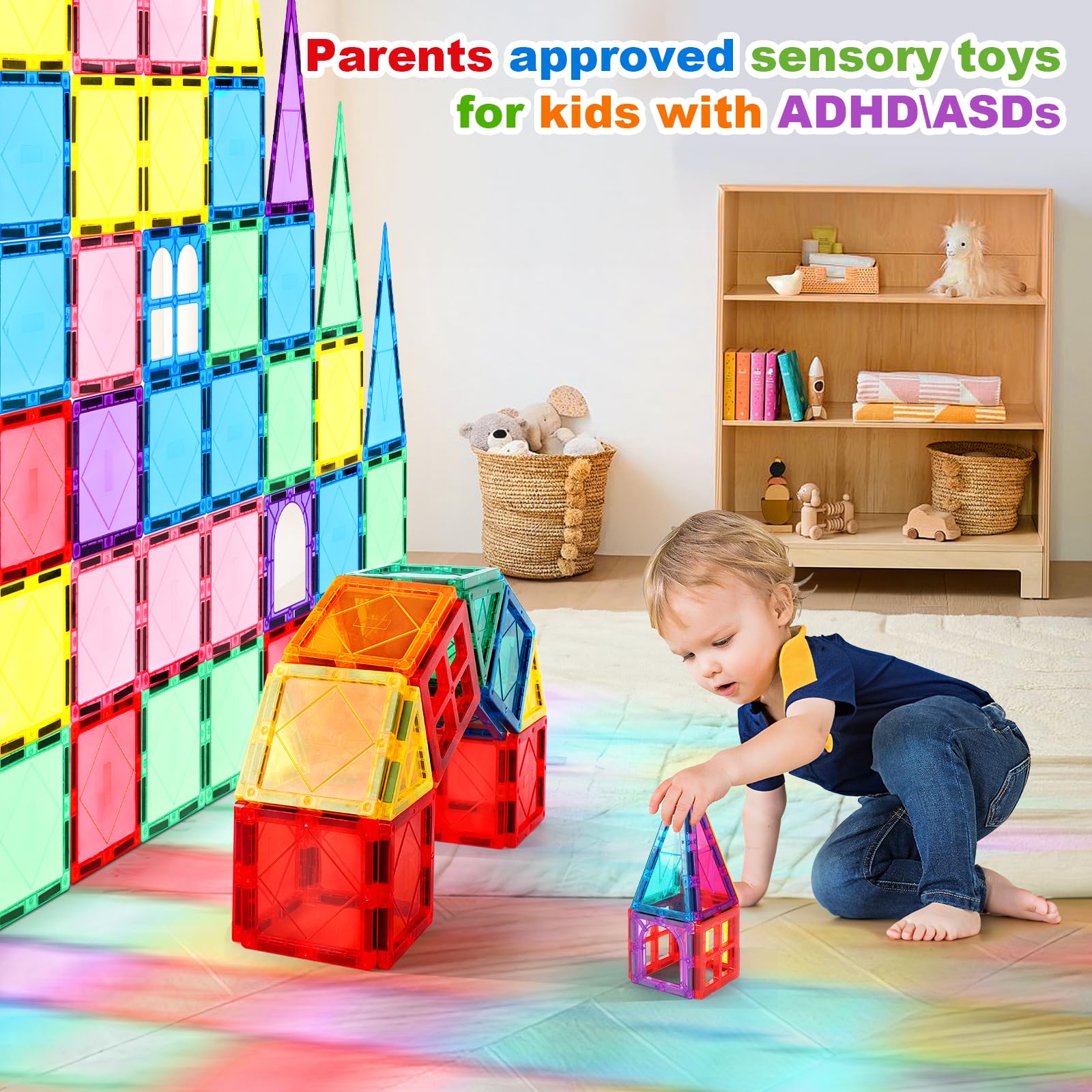 - PREMIUM QUALITY-- The magnetic tiles for kids ages 3-5 are with stronger magnets and high quality ABS materials for children toys. The safety priority with durable sturdy rivets & smooth edge surfaces. DIY entertaining construction toys created by senior designers for easy learning, teaching and happy childhood. Unique & novelty magnet toys for children 3 4 5 6 7 8+ years old.
