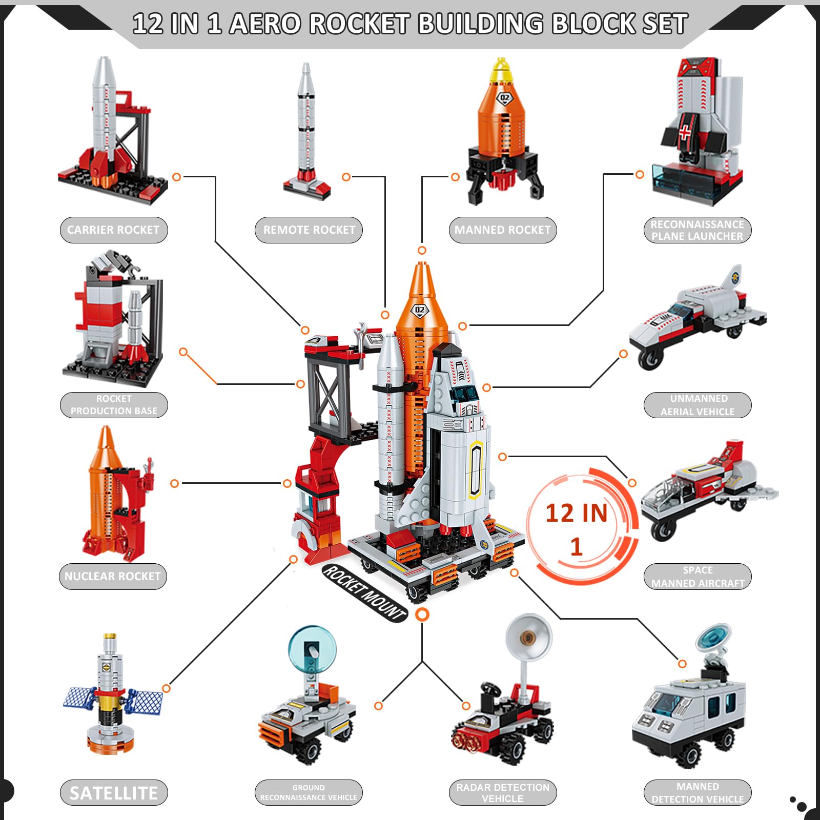 - [12 in1 Tranforming Aerospace Toys]:With this space exploration 12 in 1 set.Kids ages 6+ get 13 different build and play experience.Kids can choose to build a super cool space shuttle lanch center or 12 different space modles,such as satellite, space transport vehicle, rocket, space charging station, signal transmitter, and so on.