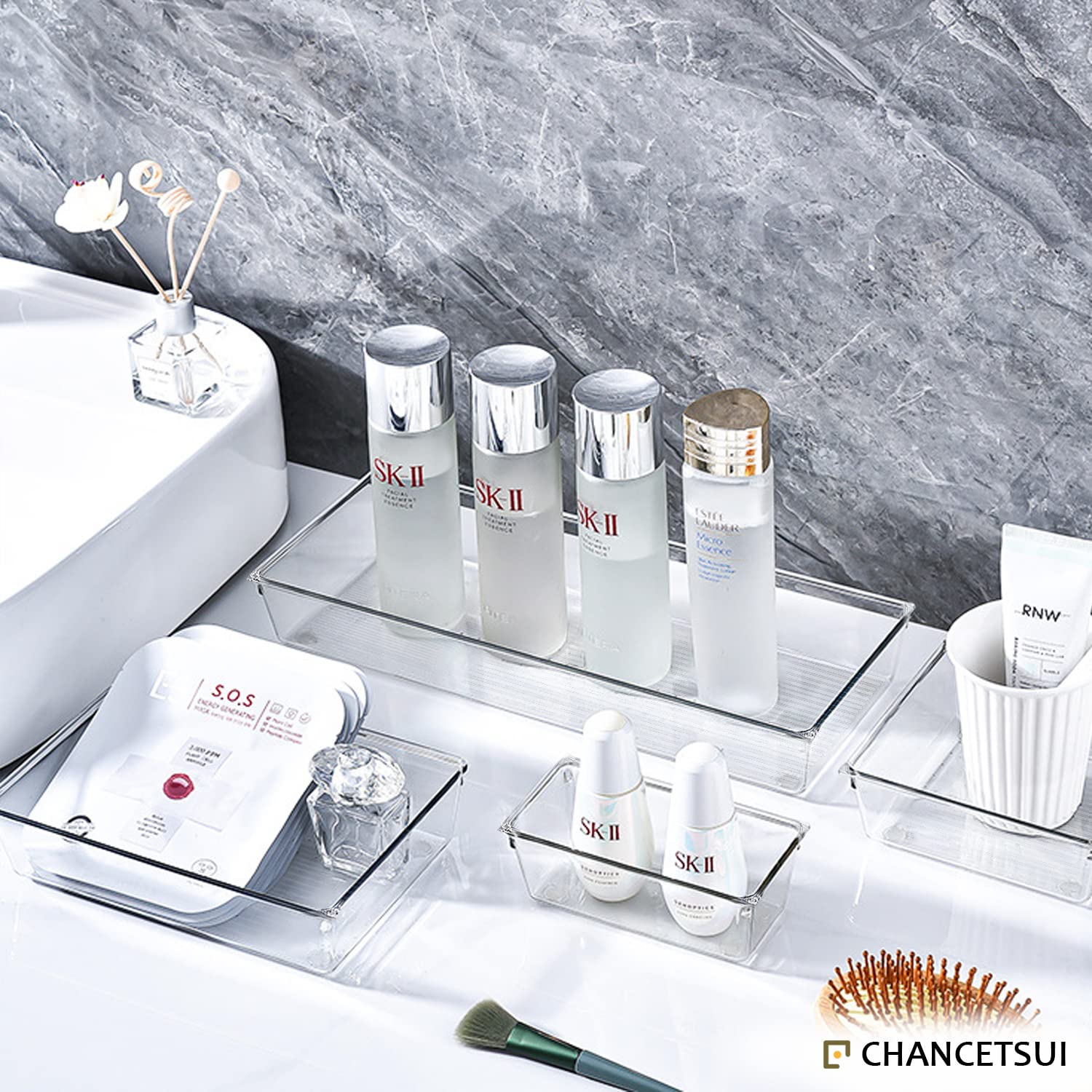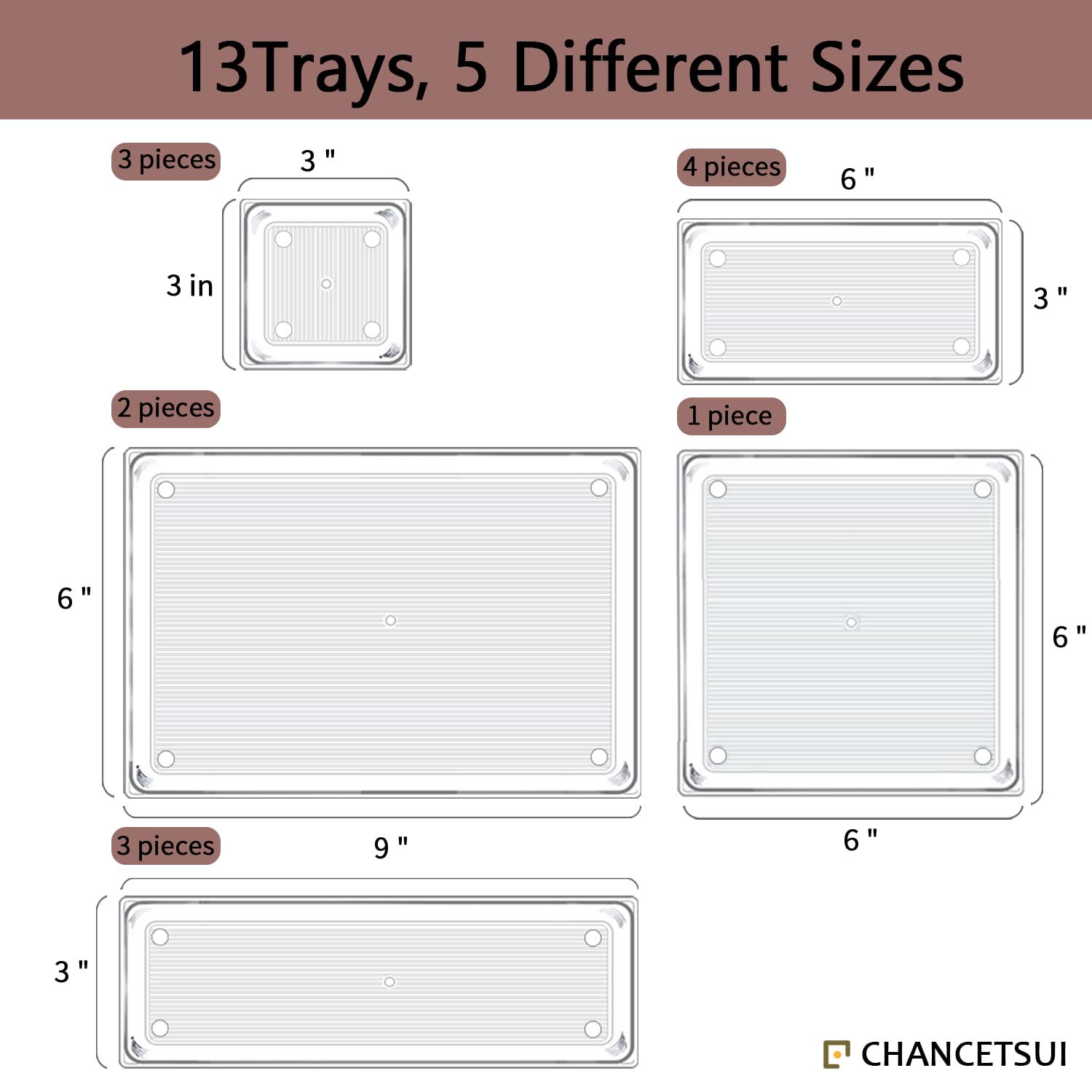 - [13 PCS SET] A 13 pcs clear drawer organizers set that included 5 different tray sizes. Package includes: 9 x 6 x 2 inches (2 pcs), 9 x 3 x 2 inches(3 pcs), 6 x 6 x 2 inches(1 pcs), 6 x 3 x 2 inches(4 pcs), 3 x 3 x 2 inches(3 pcs).