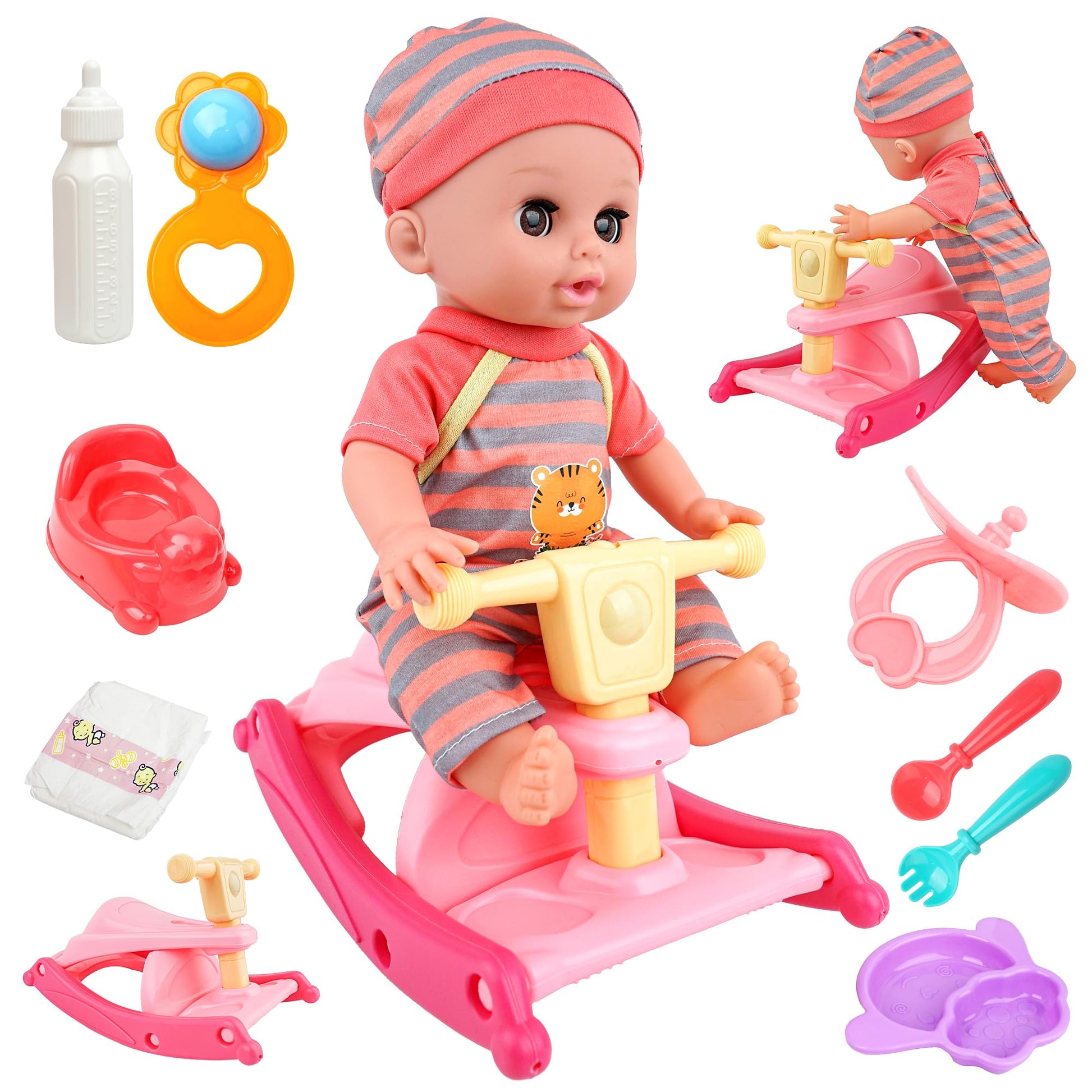 - 【Pretend Play Toys Set】The doll set includes talking baby doll, electric rocking horse, doll toys, doll diaper, baby bottle, baby pacifier, baby training potty, doll bib and doll tableware feeding accessories, as well as cute doll clothes. The rich and realistic set meets girls' needs for pretend toys. Baby doll accessories set. Dolls for girls over 2 years old.