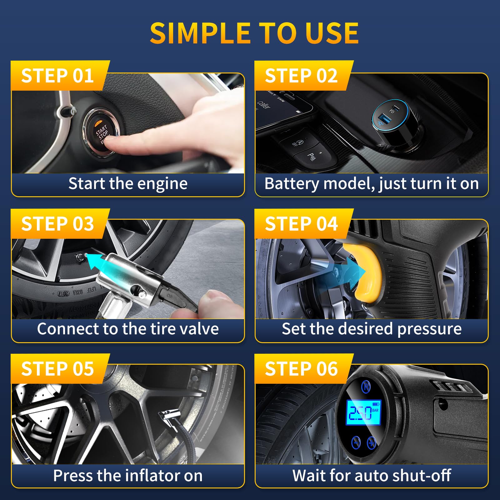 - 【Extended Power Cord & Hose】 Features a 9.8ft power cord and a 1.64ft inflation hose, providing ample reach for all car tires and making inflation hassle-free.
