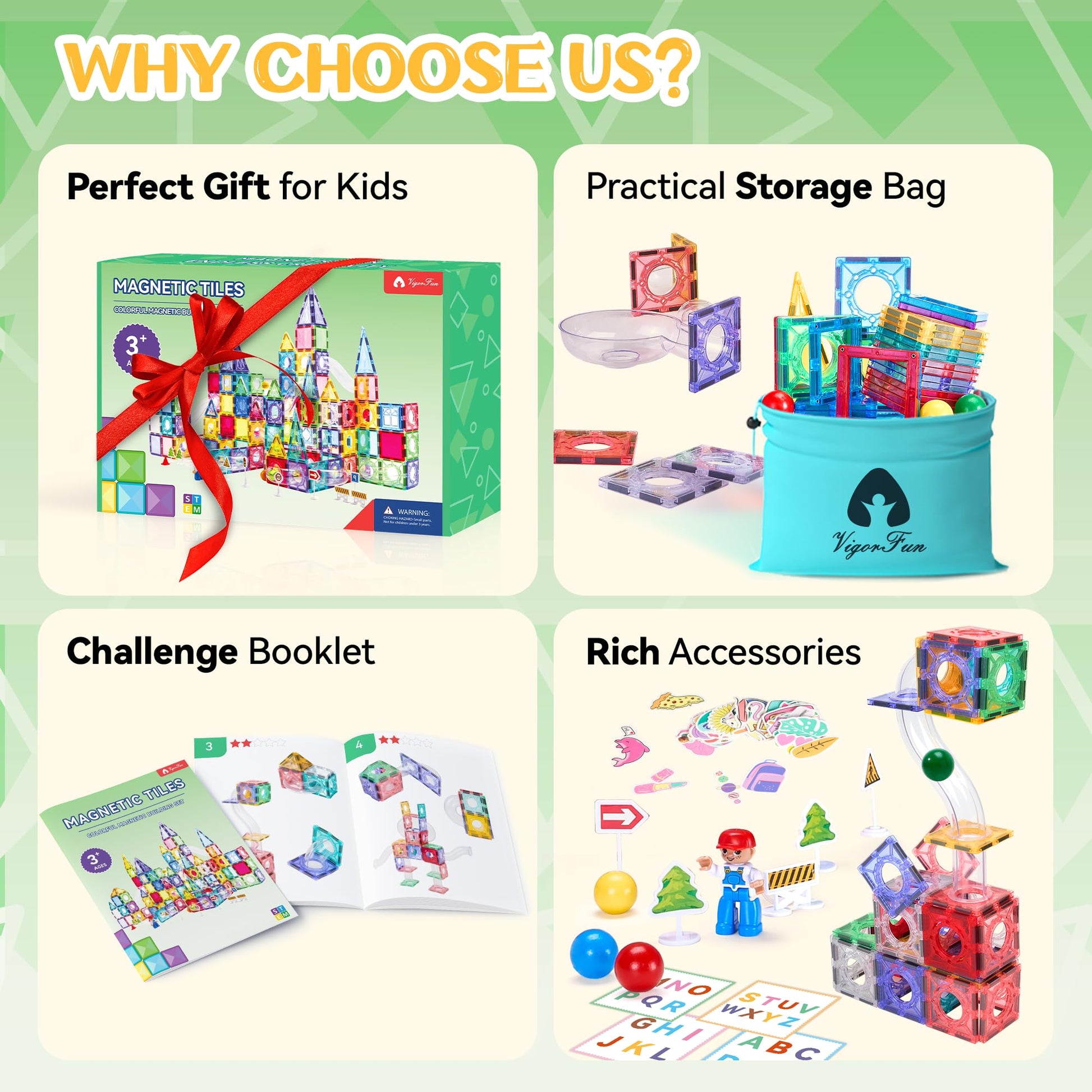 - Innovative Magnetic Toy Set: This 171-piece toy set includes magnetic tiles, transparent marble run race tracks, toy figures, stickers, and alphabet educational cards, perfectly combining the classic marble run game with magnetic tile toys. The innovative gameplay allows children to experience the joy of complex construction while also achieving a sense of accomplishment in building their own race tracks