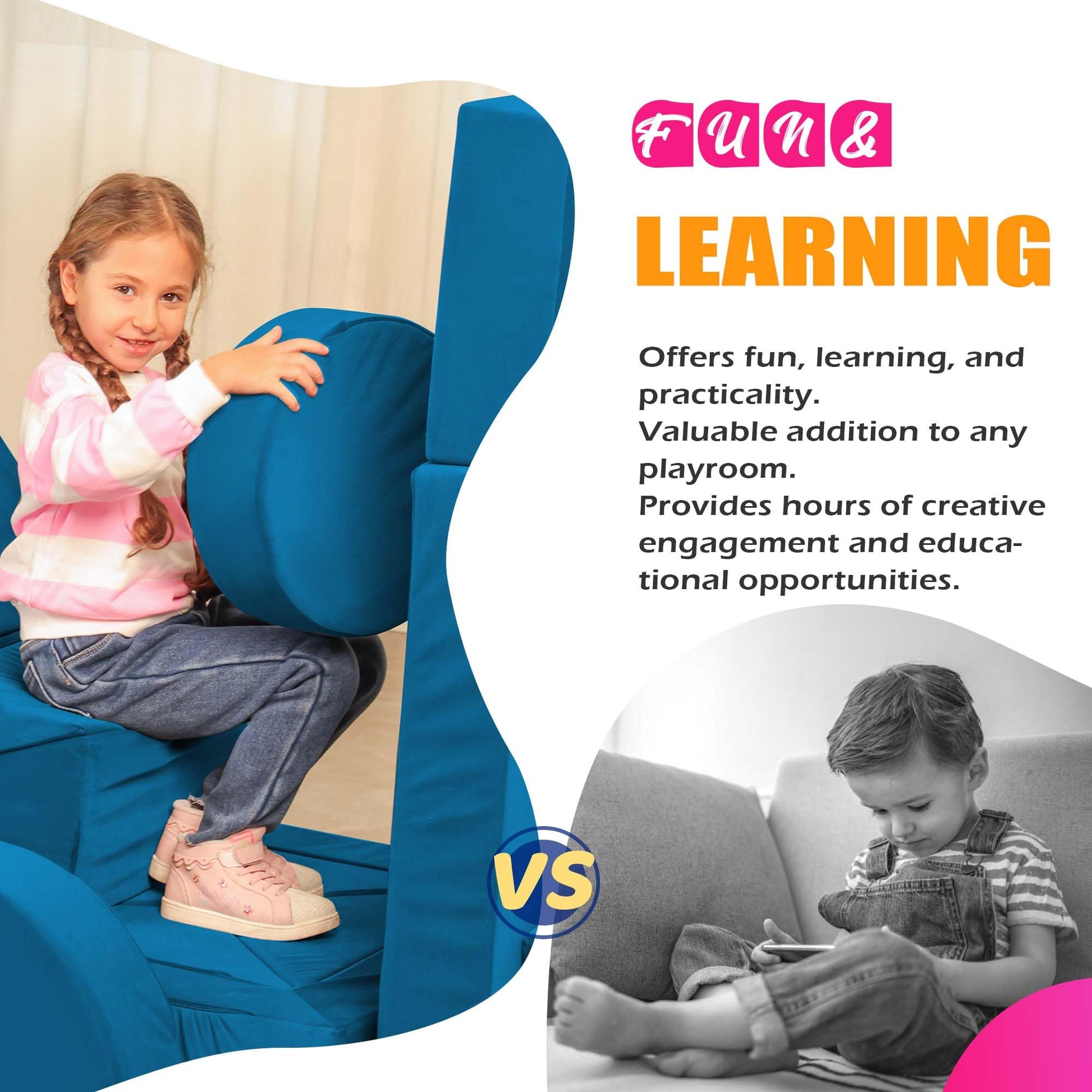 - 18-Piece Playful and Educational Modular Kids Sofa - The sofa is made of 18 foam pieces in a variety of shapes, including squares, triangles, circles, half-circles etc. These pieces can be used to create a variety of structures, from a simple sofa to a complex castle or rocket ship etc. Children can use their imagination to come up with new and innovative ways to use the pieces. Dimension: 27.5"D x 94.5"W x 18.1"H