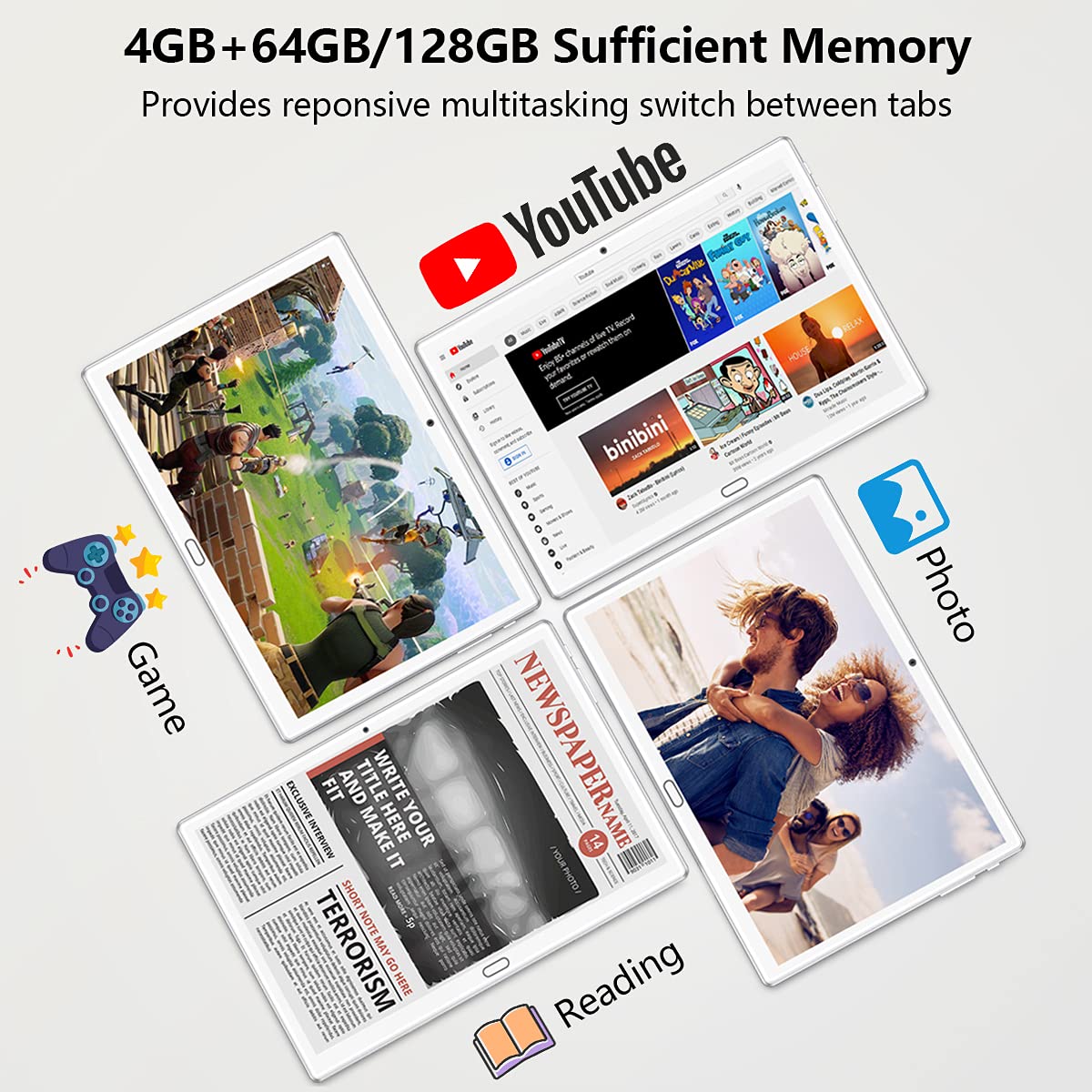 - 👍[High Performance] 2024 Newest Android 13.0 Tablet, equipped with a powerful 8-core processor, faster multitasking, 64GB ROM + 4GB RAM, and 128GB expansion, can store more games, movies, videos, files, and photos for you.