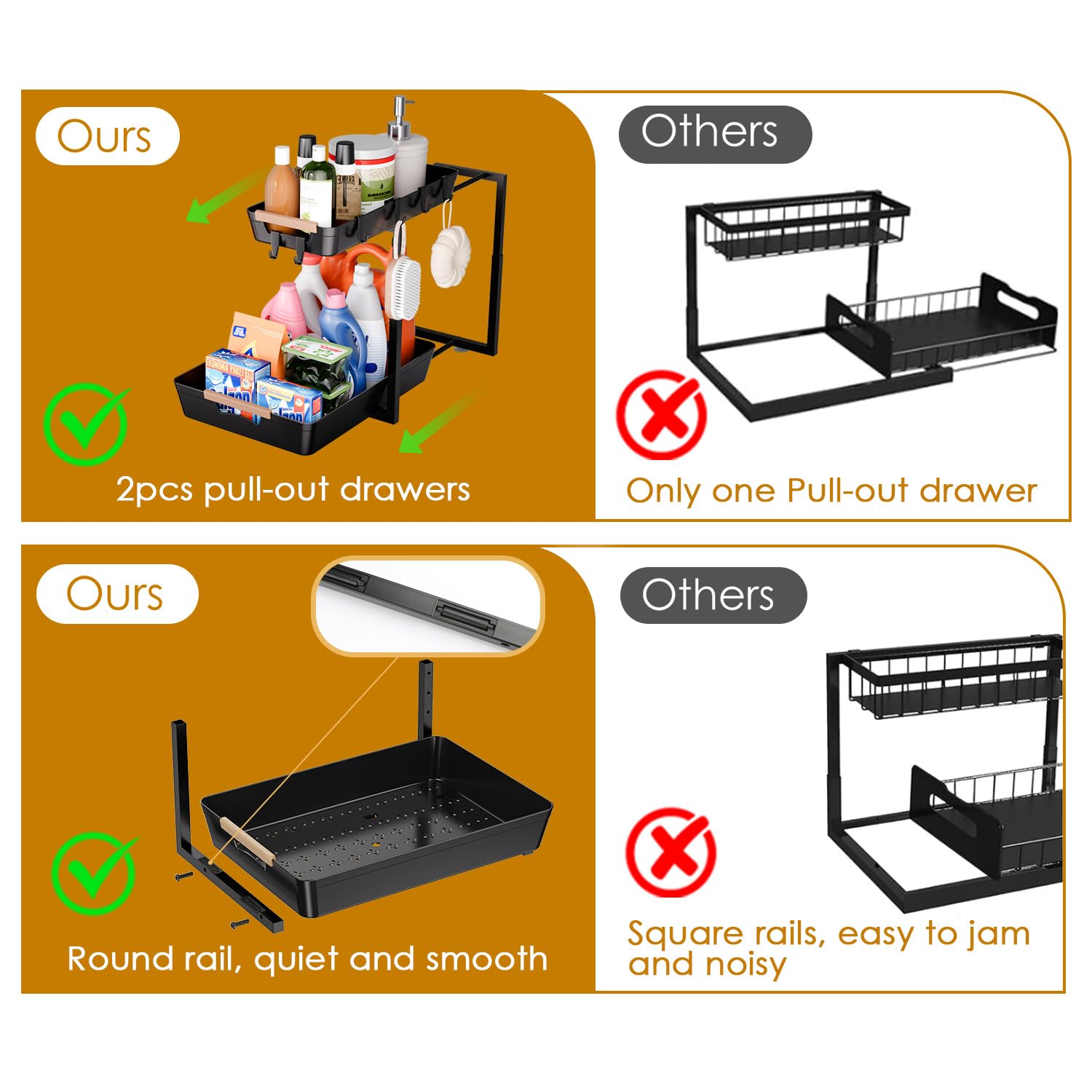 - 【SPACE-SAVING STORAGE】Our 2-tier Under sink organization and storage provides storage solutions that maximize the often underutilized space under sink kitchen and bathroom or cabinets. Easy access to everyday items.