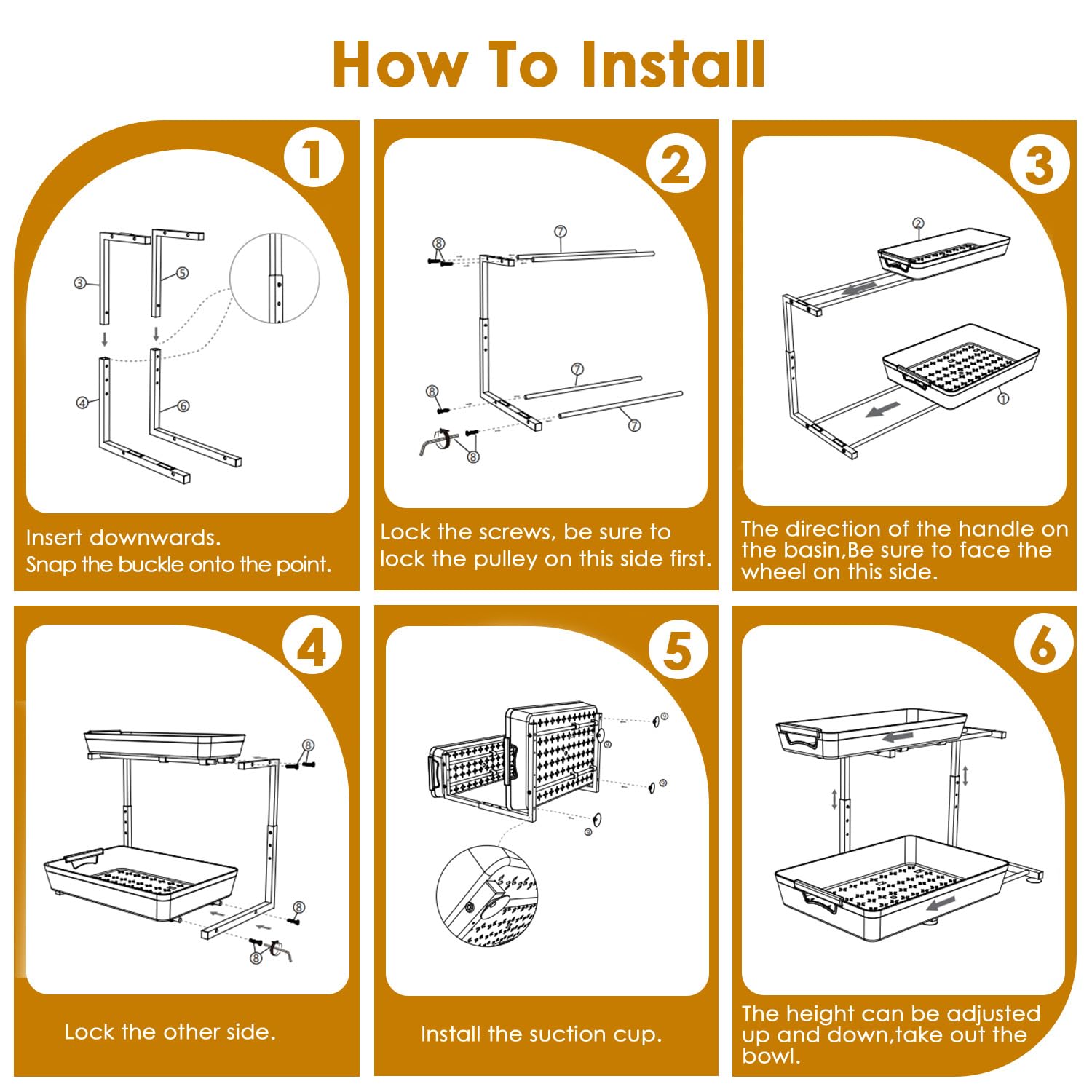 - 【SIMPLE AND EASY TO INSTALL】Bathroom organizers and storage No need to punch mounting screws, the bottom has a suction cup and tape to fix the position, prevent sliding or scratching, removable, washable. In addition, our kitchen sink shelf has 12 hooks and 8 non-slip mats. Make the sink organizers under the bathroom more stable. Installation takes only a few seconds: 1. Insert downwards. Snap the buckle onto the point. 2. Lock the screws, be sure to lock the pulley on this side first. 3. The direction of the handle on the basin, Be sure to face the wheel on this side. 4. Lock the other side. 5. Install the suction cup. 6. The height can be adjusted up and down,take out the drawer.