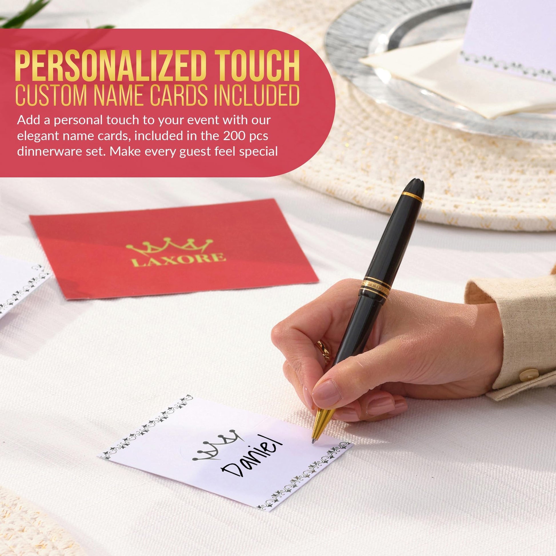 - SILVER DINNERWARE SET: 200 PCS Plates and utensils set includes 25 7’’ & 25 10’’ disposable plates for party 50 Forks, 25 Spoons, 25 Knives, 25 Napkins, 25 Guests Name Cards