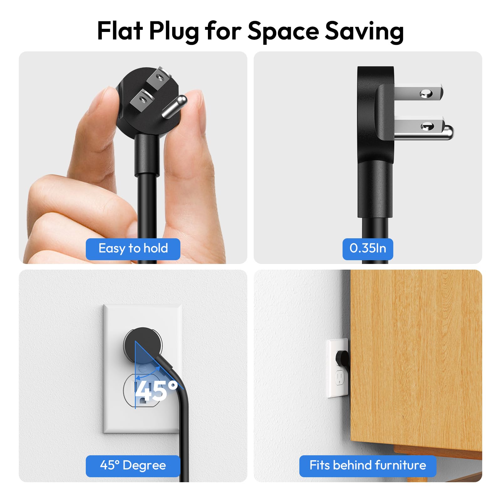 - 【10 Ft Extension Cord】If you have few outlets in your home, you know how difficult it is when you want to charge your phone anytime and anywhere. The extension cord 10 ft can provide the perfect solution, providing the flexibility to connect to distant outlets and hard-to-reach places. With its 0.53-Inch flat plug, it can be easily installed in small spaces behind furniture, bookshelves, and tables, saving a lot of space.