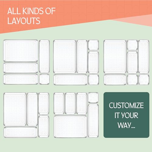 25 PCS Clear Plastic Drawer Organizers Set, 4 Sizes Clear Drawer Organizers & storage Bins for Makeup/Jewelry Vanity, Kitchen Gadgets Or Office Desk. Bathroom Drawer Organizer Trays With Non-Slip Pads