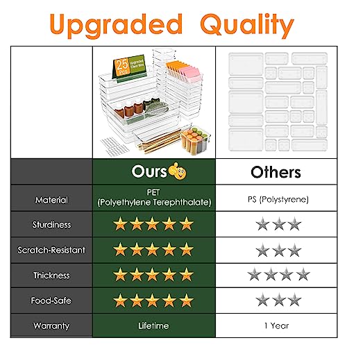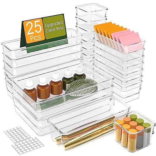 25PCS Extra Sturdy Clear Plastic Drawer Organizer Trays with 100pcs Non-Slip Pads, 4 Sizes Desk Drawer Divider Organizers and Storage Bins for Makeup, Bathroom, Office, Kitchen, Bedroom, Jewelry