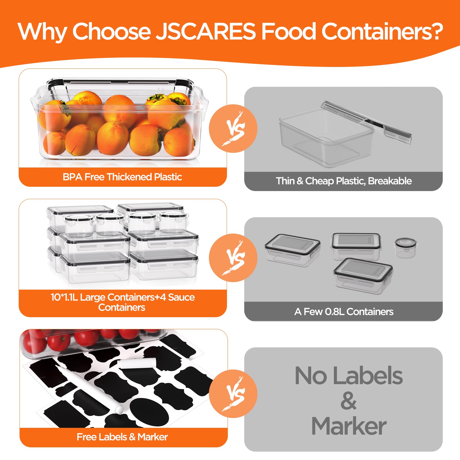 - Large Containers Set - Our 14 pack food storage container set is available in larger sizes. Unlike storage sets that contain multiple useless small containers, this set contains 10 1.1L (37OZ) rectangular containers and 4 0.08L (2.7oz) round containers that you'll find perfect for leftovers, meal prep, fruits, vegetables, salads, grains, and more. Every box is useful to keep your pantry organized and enjoy the convenience of easy-to-stack containers