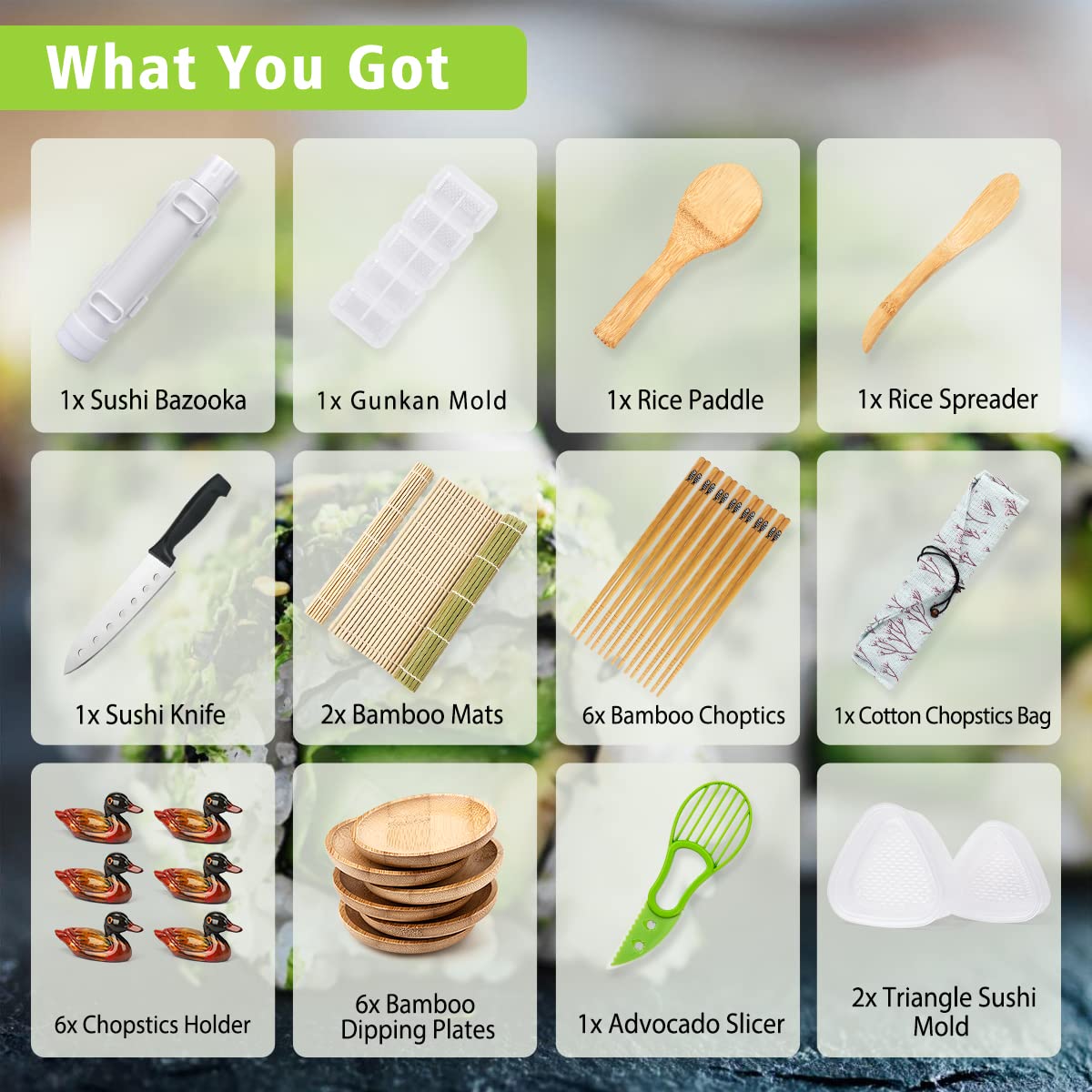 - Complete Sushi Making Kits:The package includes 1*Sushi Bazooka,2*Bamboo Mat,1*Rice Paddle,1*Rice Spreader,1*Sushi Knife,1*Sushi Rice Mold,2*Triangle Sushi Mold,6*Bamboo Chopsticks,6*Chopstick Holder,6* Bamboo Sauce Plates.The kit provides everything you need to make sushi in minutes.