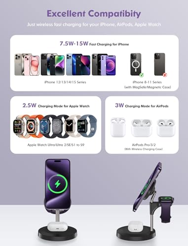Details: Aeinidi 3 in 1 Wireless Charging Station for Multiple Devices Apple, 15W Fast MagSafe Charger Stand with QC3.0 Adapter,Magnetic Charger for iPhone 14 13 12 Pro Max/Plus/Pro/Mini, iWatch, AirPods 3/2 Pro