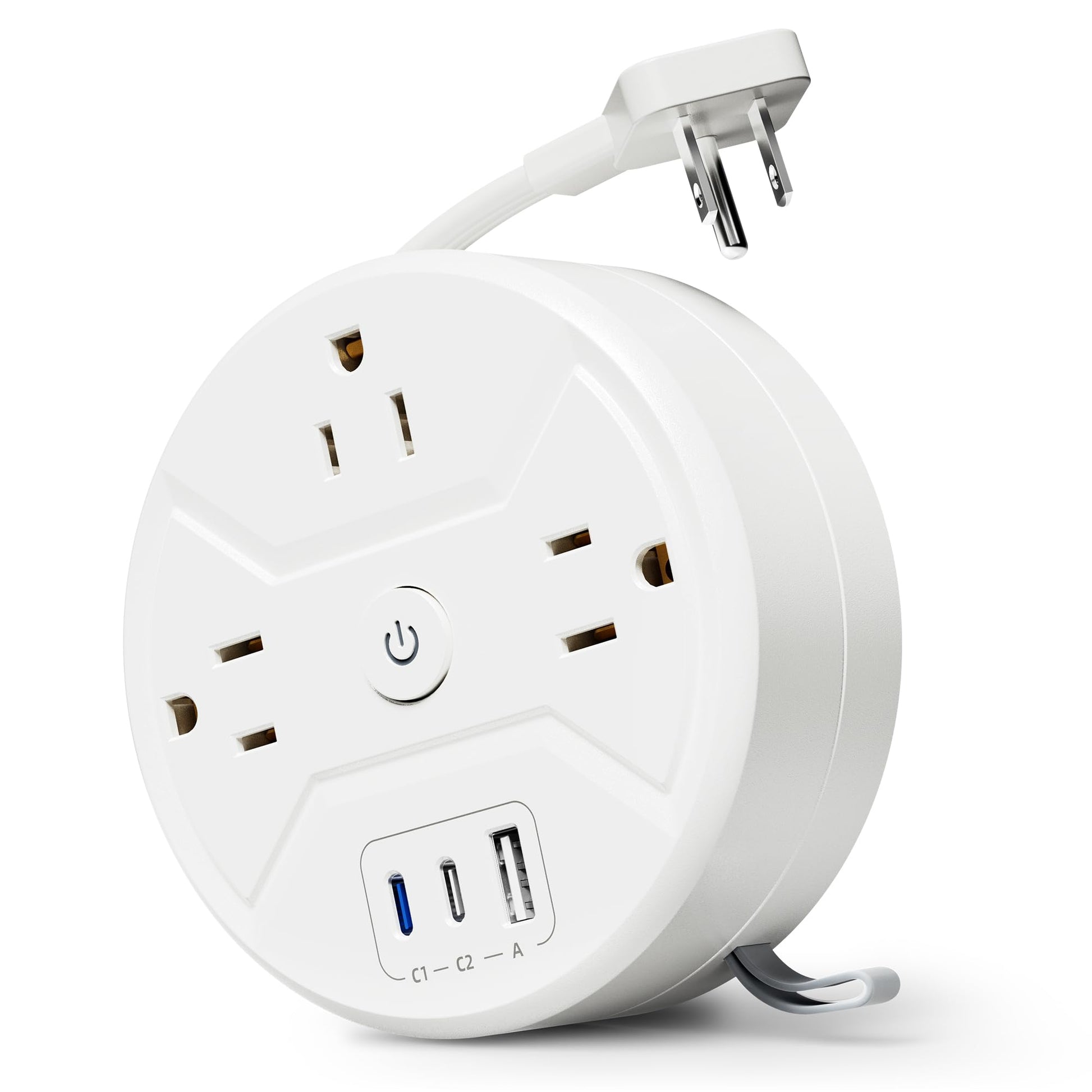 - 5FT RETRACTABLE CORD: Power cords were always a pain in the neck when you’re packing for a trip, but now they are not. With a built-in roller to wind up the 5ft extension cord, you won’t have cable clutter in the suitcase or on the desk. You can decide how long cord you need for the connection and leave not an inch of unwanted length outside.