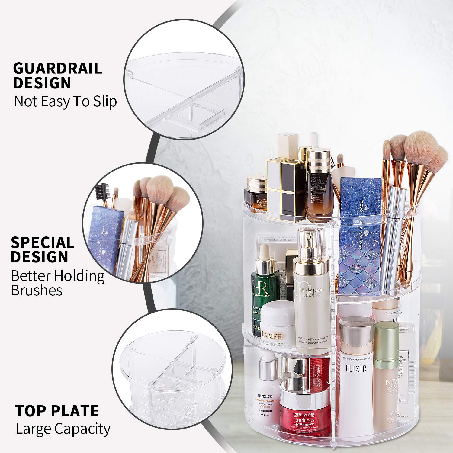 - KEEP YOUR VANITY ORGANIZED: We designed the cosmetic storage 360-degree rotating cosmetic organizer to provide you with a simple way to keep your makeup brushes, skin care creams, cosmetics and more in one convenient place. Our makeup brushes organizer can be rotated so you can find what you need easily.