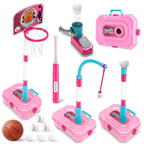 - 【4 Ways to Play】: ① Toddler Basketball Hoop: equipped with an adjustable basketball stand and mini basketball ② Children's hanging tee baseball: equipped with a retractable bat and 3 baseballs. ③ Automatic pitching machine: A baseball that automatically pops up when hit, equipped with 3 baseballs. ④ Baseball Tee Stand: The traditional tee can better help kids practice how to hit the ball.