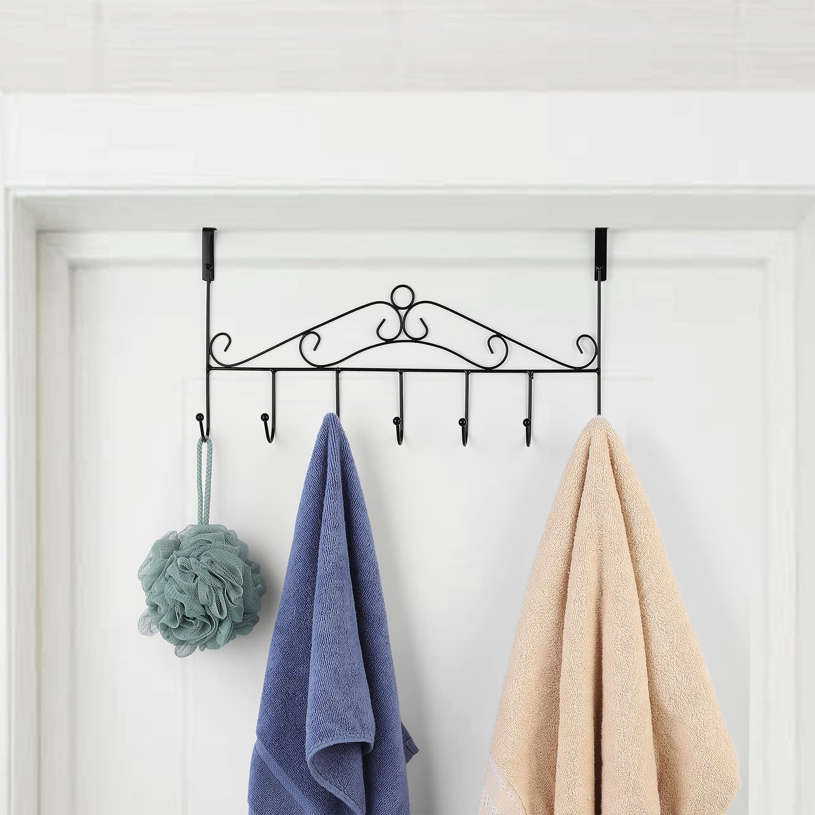 - 🌂【Multi-Purpose】The door hanger with 7 hooks to create an extra space of your door, you can hang clothes, hats, belts, bags, towels, etc. Keep your bedroom, bathroom or kitchen neat and organized.