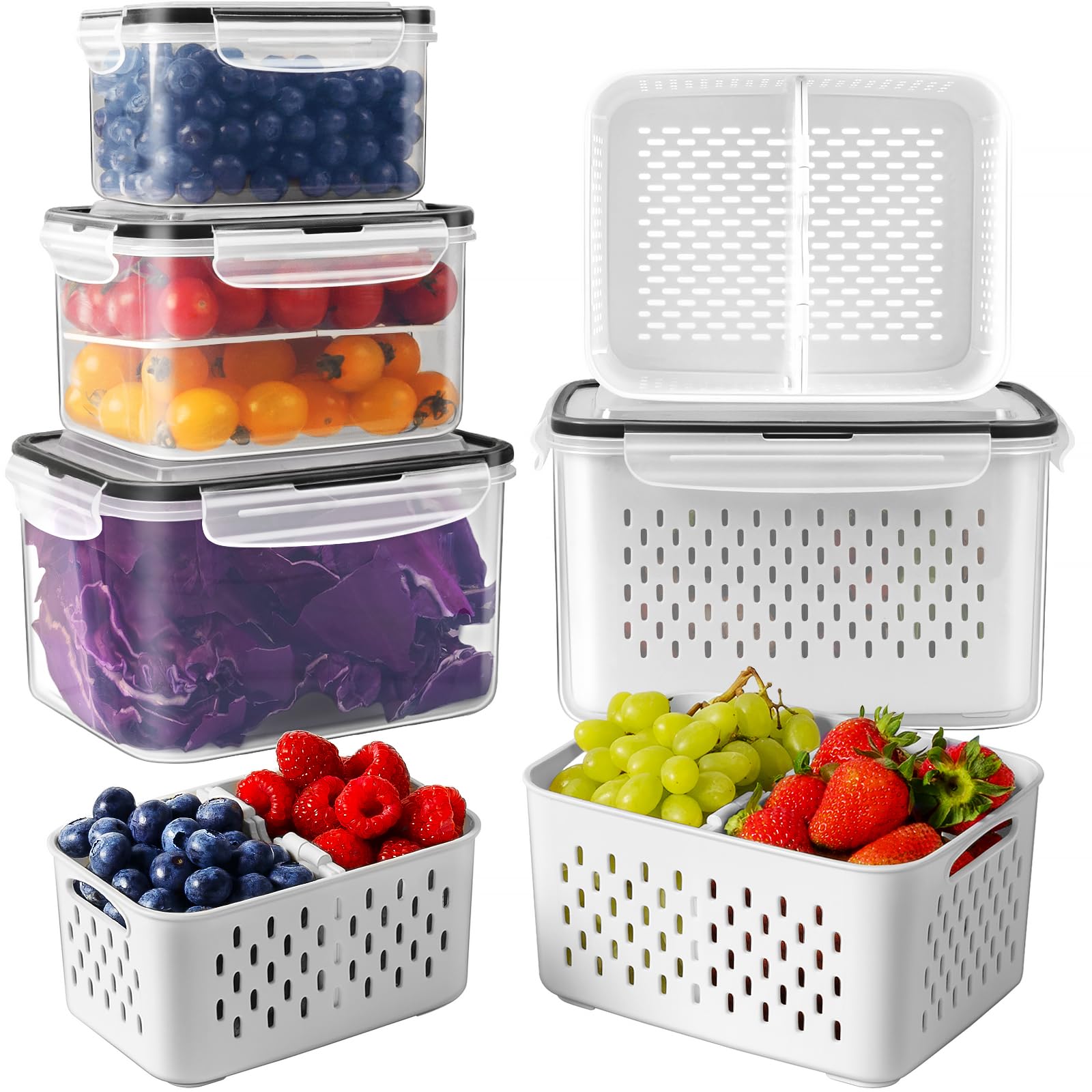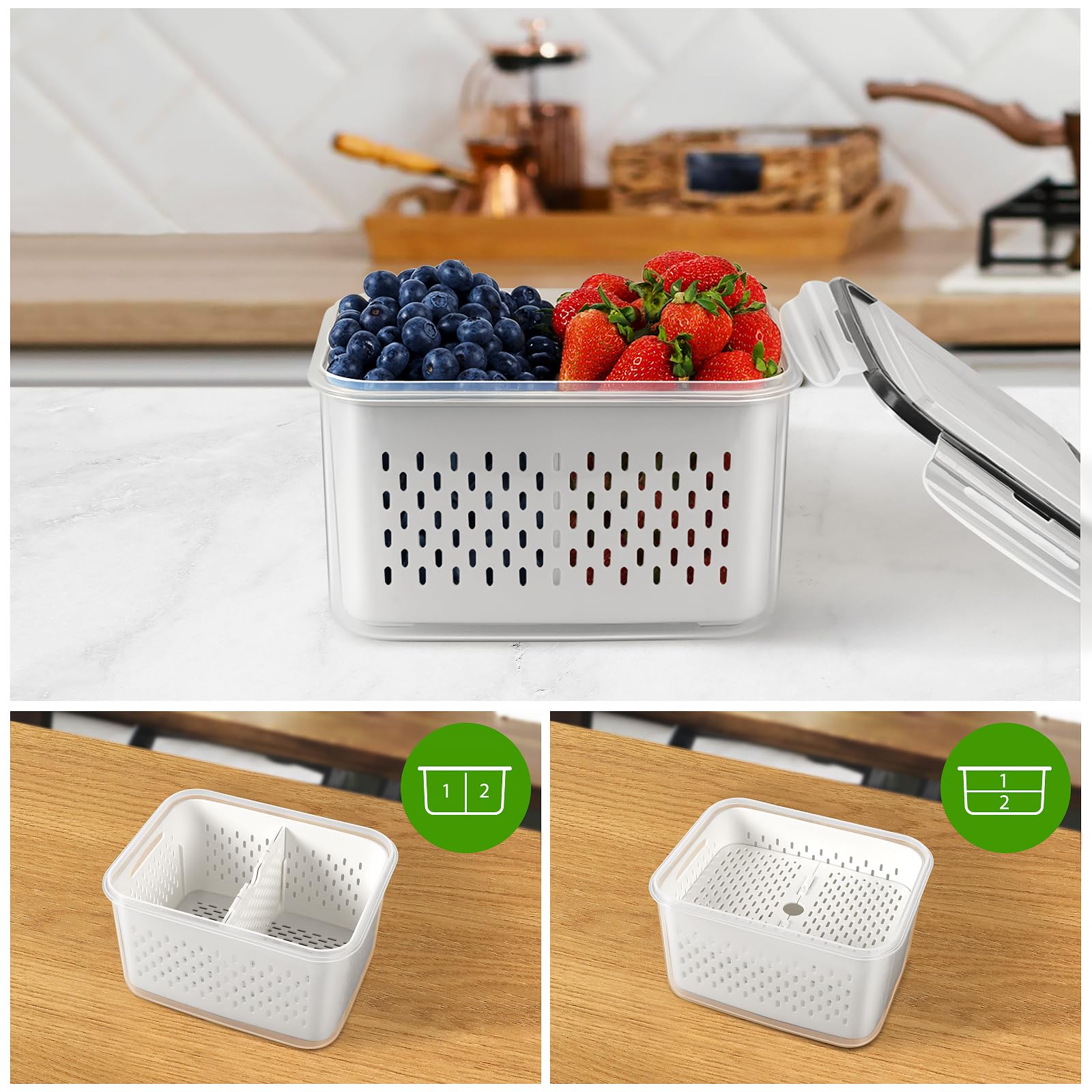- Keep food fresh for longer : The berry containers for fridge have a sealed environment built with the colanders and snap locks. The built-in colander can separate water droplets attached to fruits, thereby prolonging their freshness