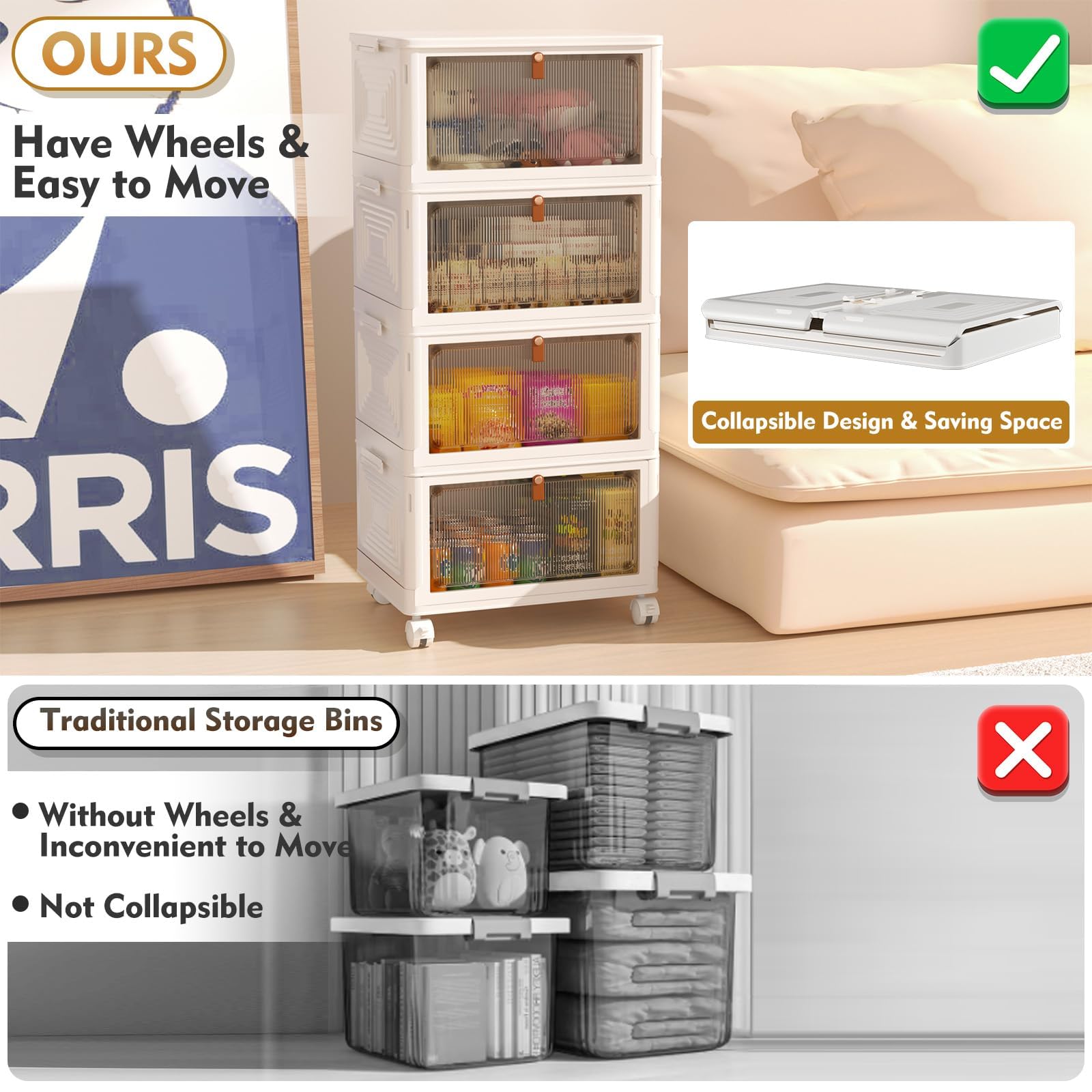 4 Tier Plastic Storage Bins with Lids 23QT, Stackable Storage Containers with Wheels, Folding Storage Boxes, Collapsible Storage Bins, Closet Organizers and Storage for Living Room,Office,Dorm