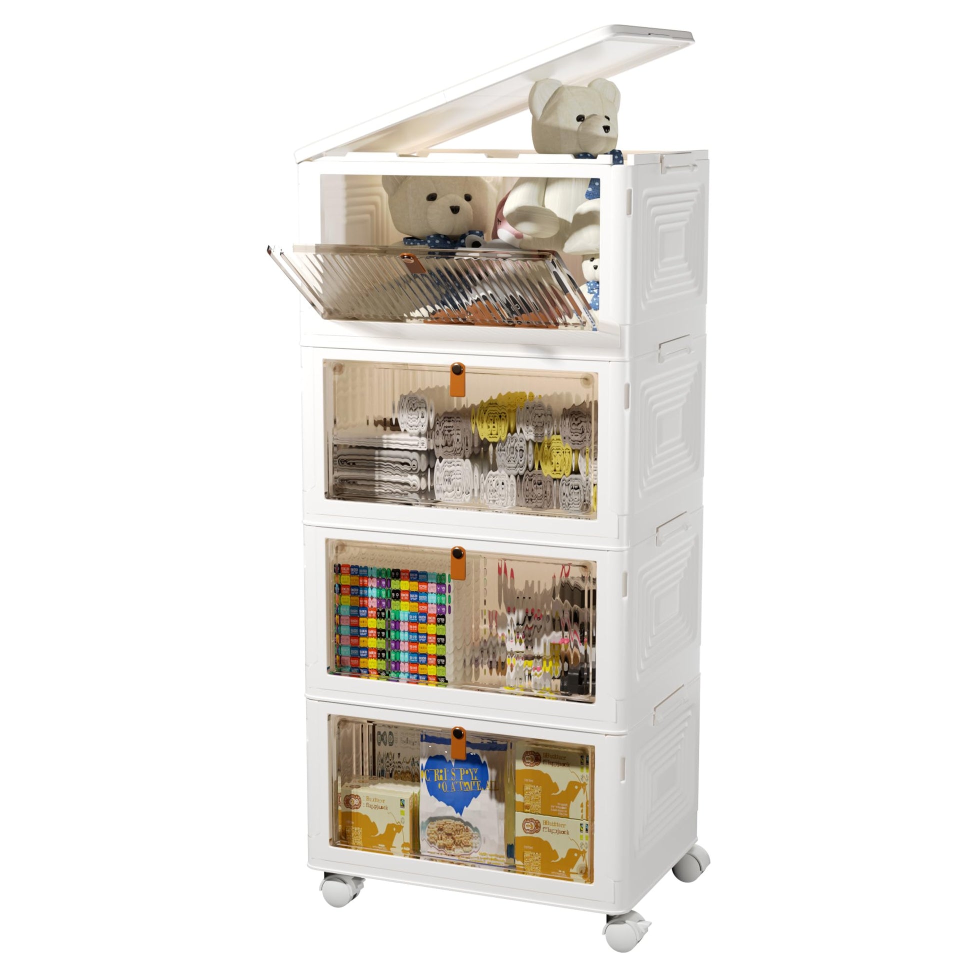 4 Tier Stackable Storage Bins with Lids, 23Qt Plastic Storage Containers with Magnetic Doors & Wheels, Collapsible Storage Bins Closet Organizers, Foldable Organization for Home, Party, Office, Dorm