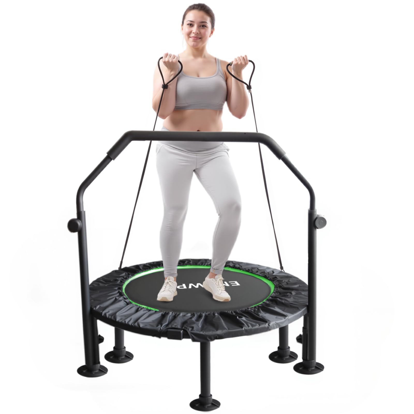 - 【Adjustable Handlebars with 4 Height Settings】: This exercise equipment features 4 adjustable height settings from 35'' to 45'' for the handlebars, making it suitable for both adults and children. Users can easily adjust the handlebars to a comfortable height that best meets their needs. Additionally, this trampoline is equipped with dual support poles and soft, non-slip foam grips, ensuring stability and safety during use.