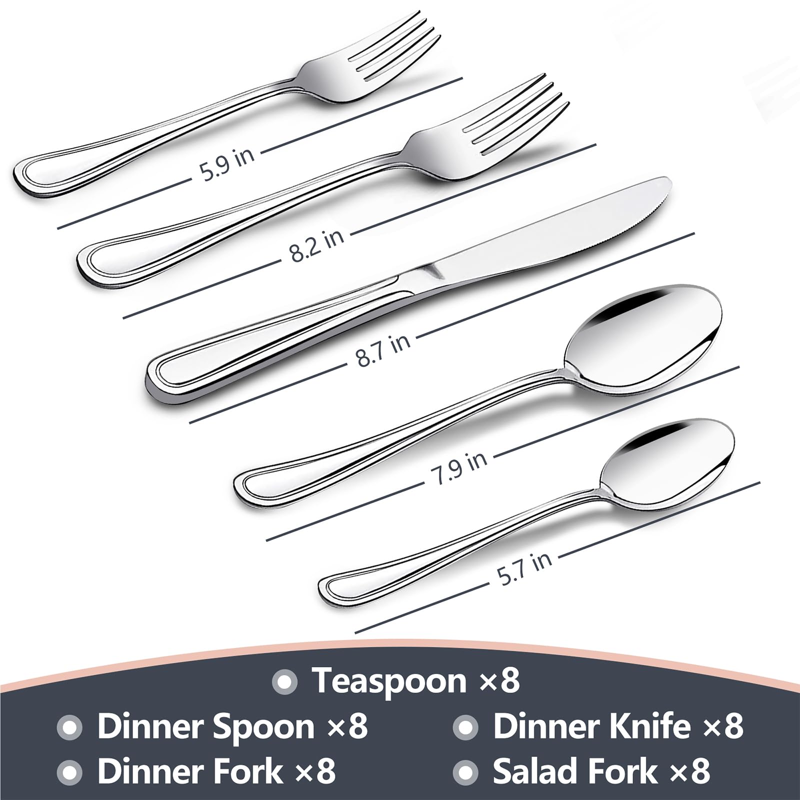 - Silverware Set Service for 8 This silverware set includes 5 dinner forks,5 dinner knives, 5 dinner spoons, 5 dessert forks, and5 dessert spoons.