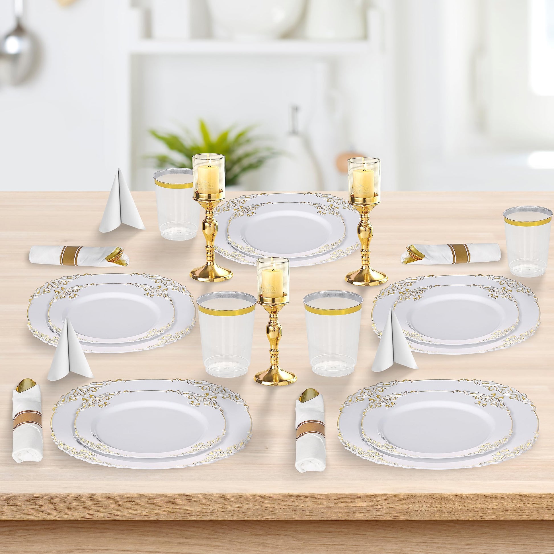 - Instant Table Elegance: Service up to 50 guests with starters, mains, and desserts with this pre wrapped silverware and napkin set! The gold shine and white napkin are sure to impress your guests.