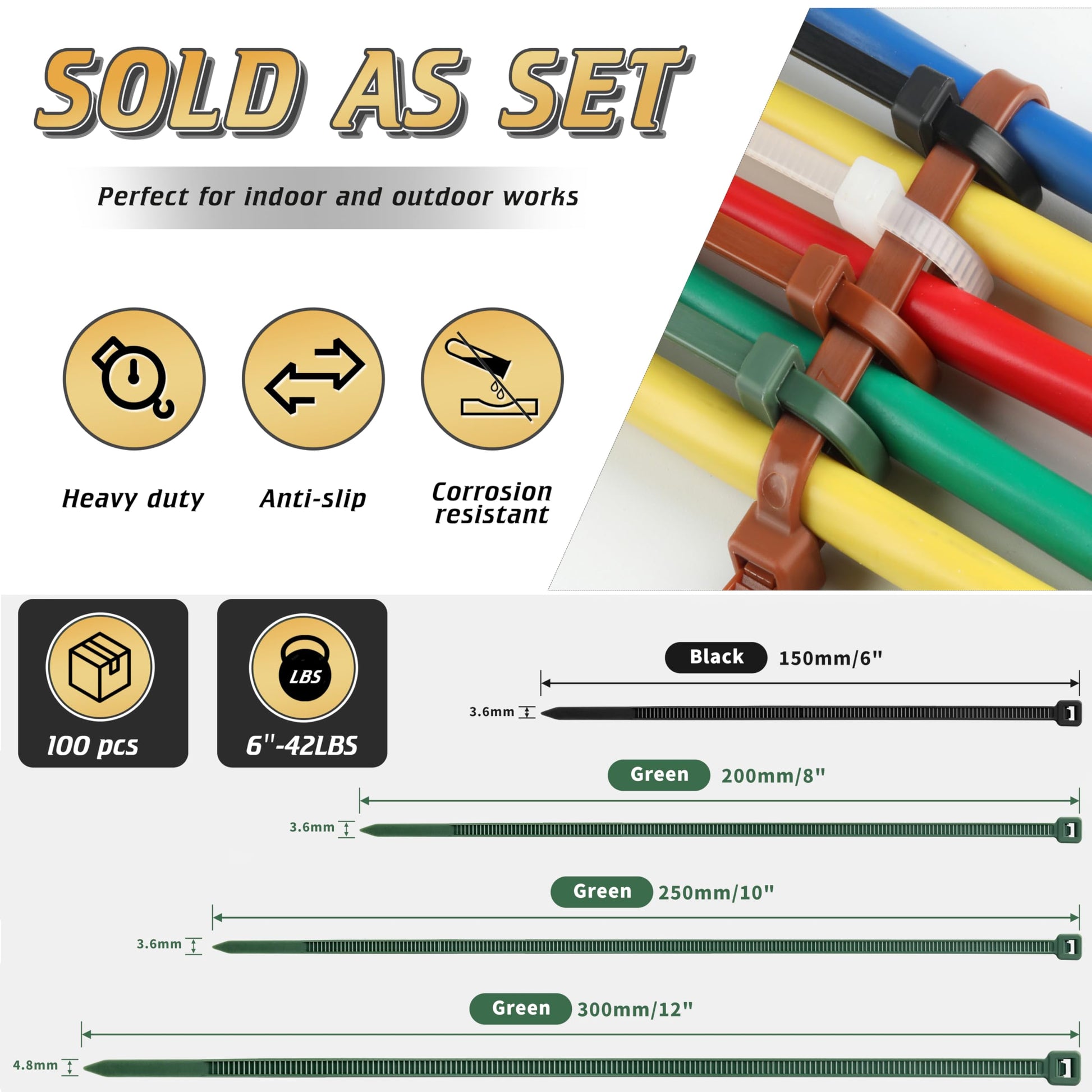 - 【42 Lbs Tensile Strength】The tensile strength of a zip tie is determined by its width. Our 6 inch premium heavy-duty cable zip ties have a width of 3.6 mm, which makes them stronger and more durable. Made with industrial-grade polyamide 66 material, these black cable ties offer better physical properties in a combination of strength and toughness.