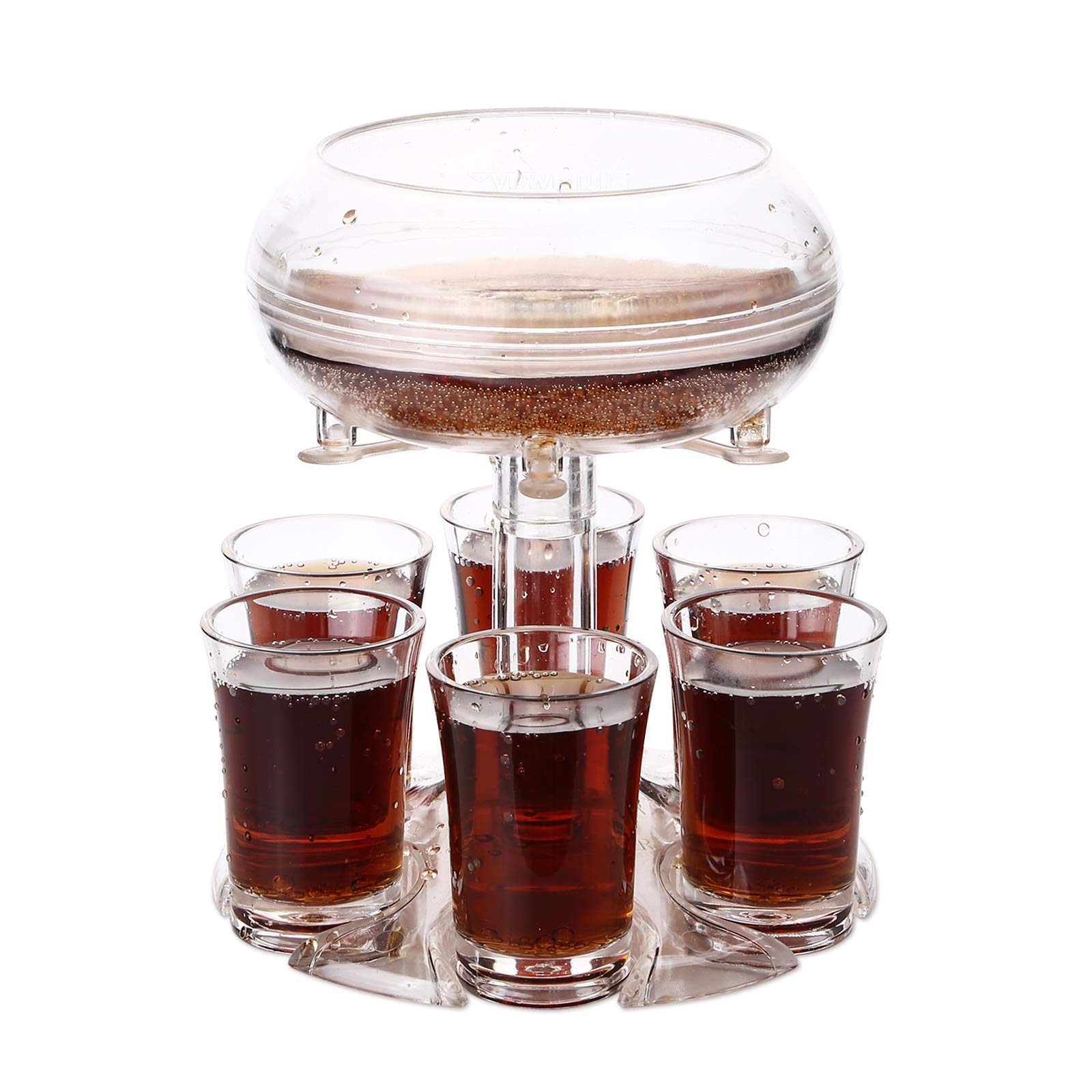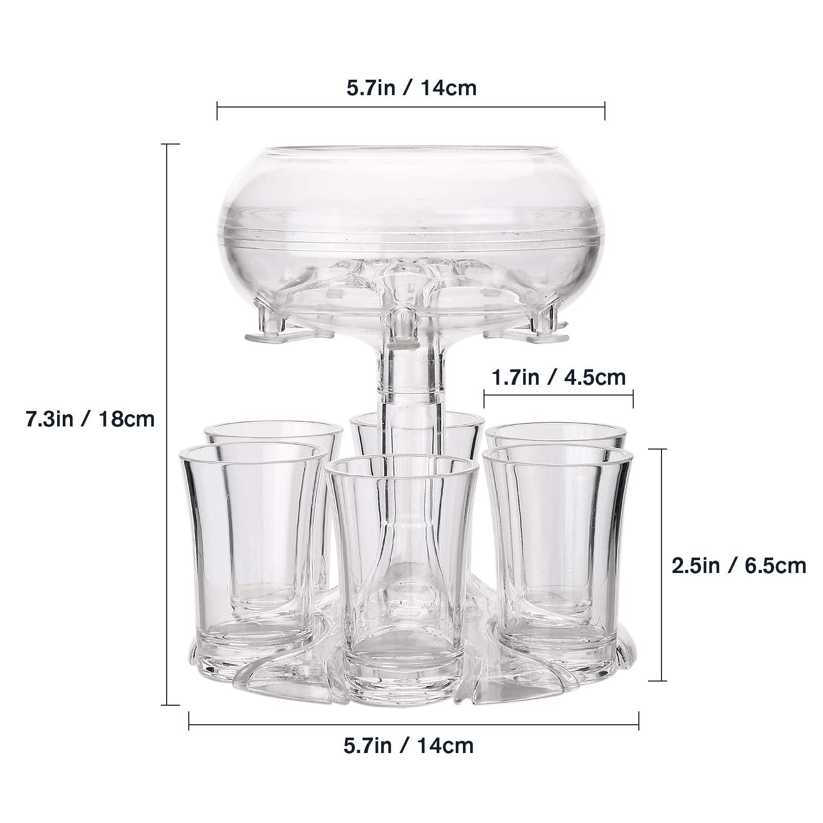 - 【What You Get】1 X Wine Dispenser(Transparent), 6 X Cup (Transparent), 3 X Hole Plug. Wine Dispenser: 3.5x5.5x6.5 inches, holds 275ml of liquid, almost half of bottle. Cup: 2.6x1.7 inches, holds 275ml of liquid. Enjoy your good wine time when you are spare at home, This is great for holidays, parties bars, and home bars. Suitable for six small glasses, glass separator products. Attention please: It is not made by glasses!
