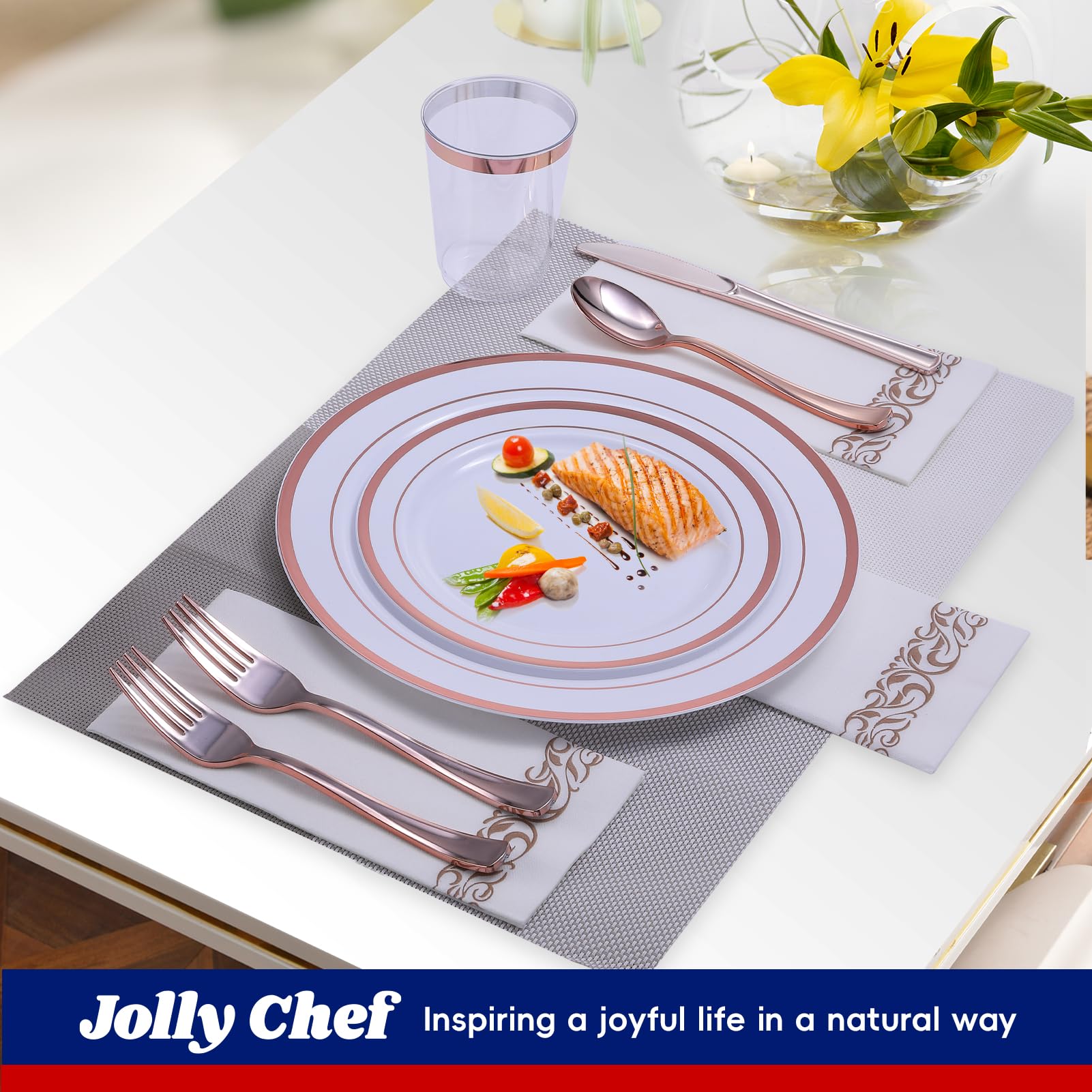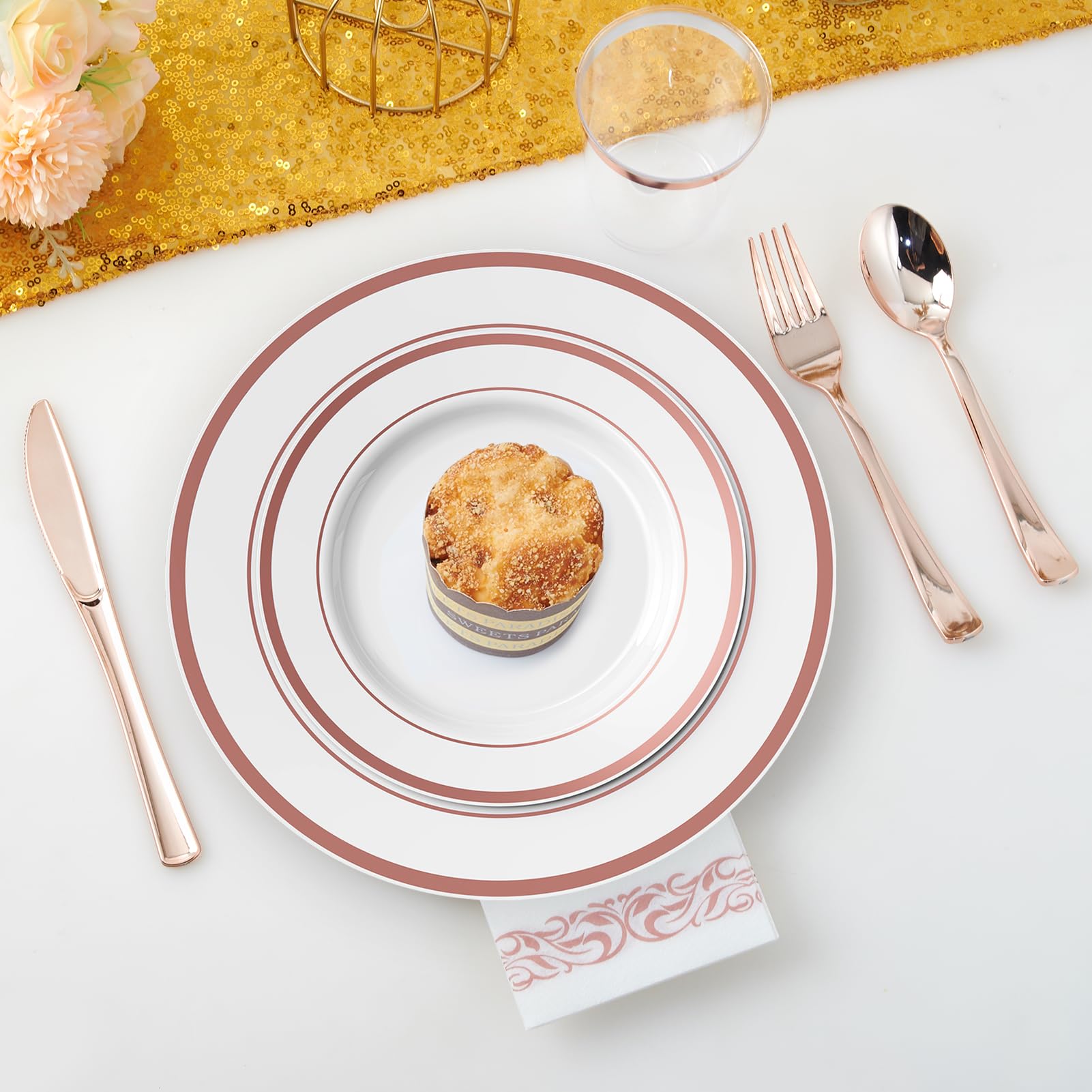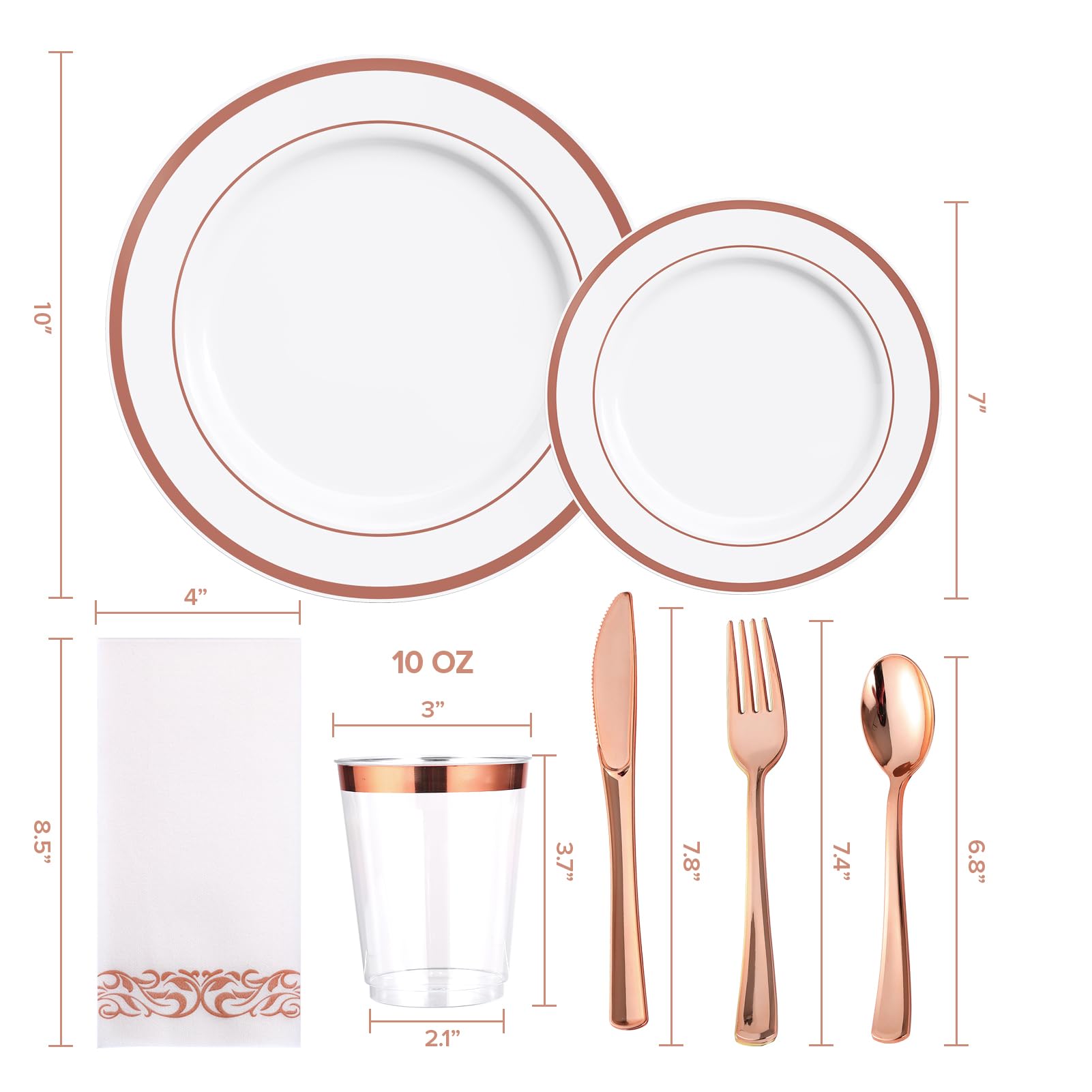 - VALUE PACK: Idea for 100 guests, our disposable dinnerware set includes 100 dinner plates, 100 dessert plates, 100 forks, 100 knives, 100 spoons, 100 rose gold plastic cups, and 100 hand napkins. Available for all types of foods