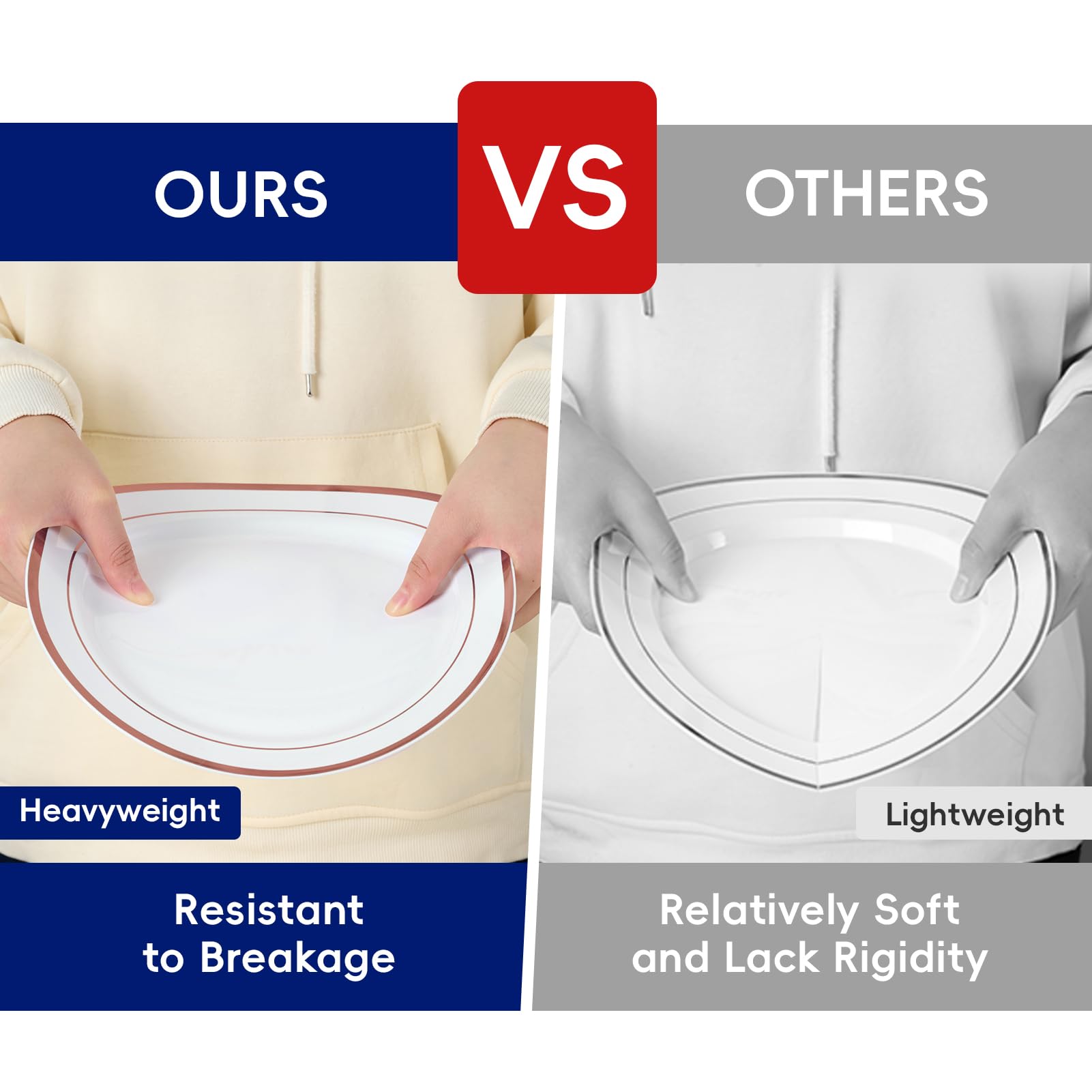 - PREMIUM QUALITY&REUSABLE: The heavyweight rose gold wedding plates . Every dinnerware set is strong enough to hold a full plate of food. Rose gold disposable cutlery has extra thick handles, even you can wipe it clean after use for the next use
