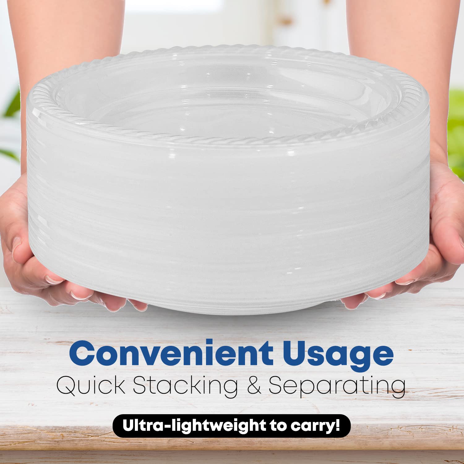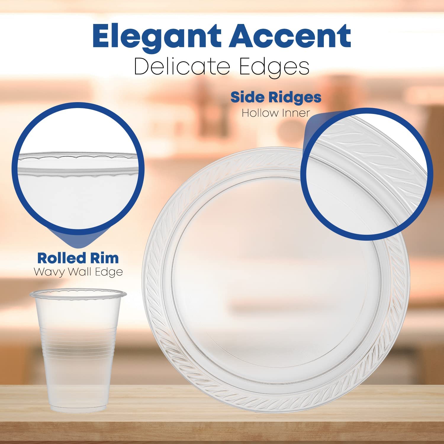 - PREMIUM CONSTRUCTION. This clear plastic dinnerware set has side ridges that prevent food spills and a thick heavy-duty layer for efficient hot and cold food servings. It is made with food-grade and BPA-free material, ensuring no harmful substances can sip in your food and drinks.