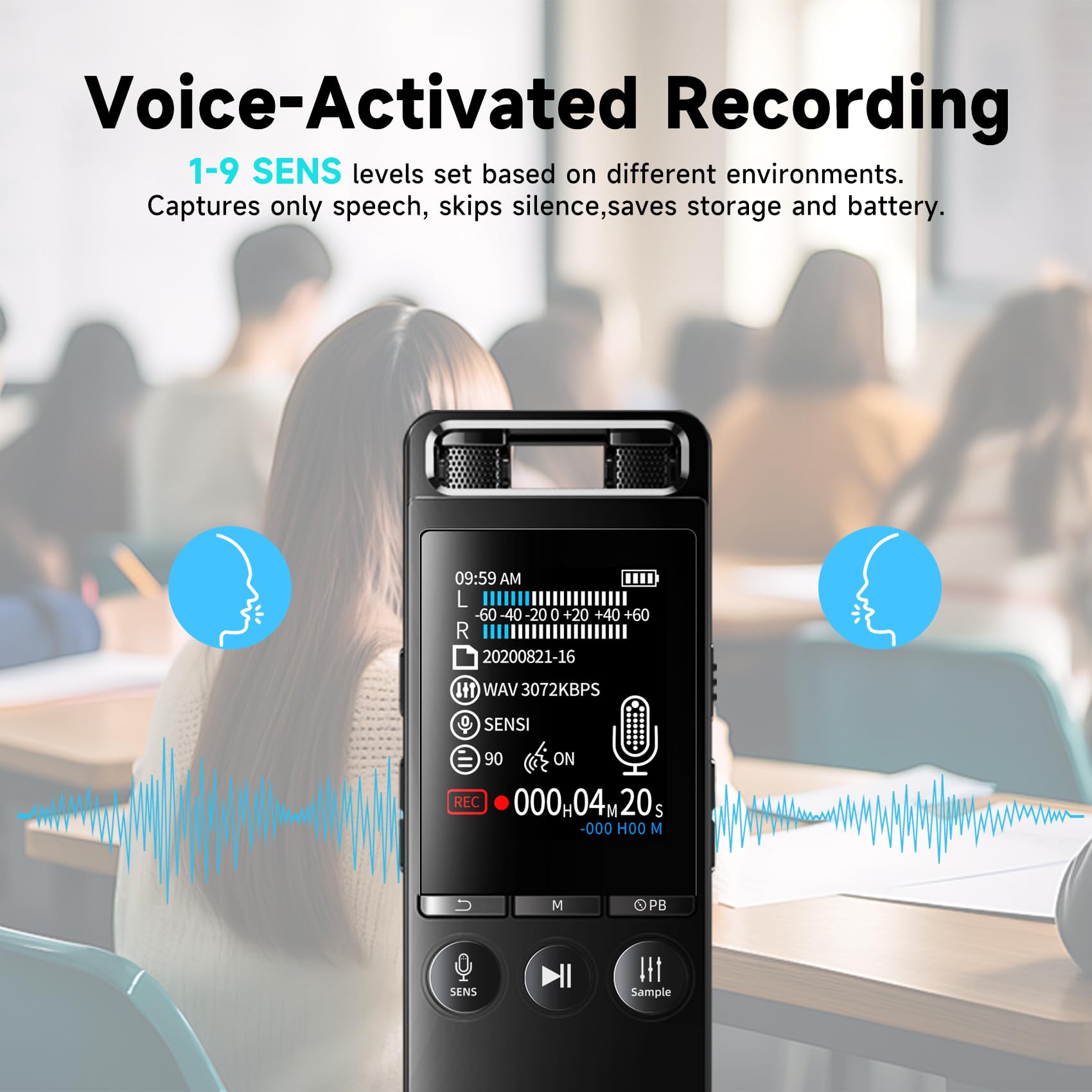 - 【 Voice-activated Digital Recorder】After enabling the voice activated recorder function and setting the sensitivity level, the digital recorder will automatically start recording when the surrounding sound reaches the set decibel level and stop when there is no sound. This feature conserves battery life and storage space, improving efficiency and reducing resource consumption. Perfect for those looking for a voice recorder voice activated feature for automated and intelligent recording.