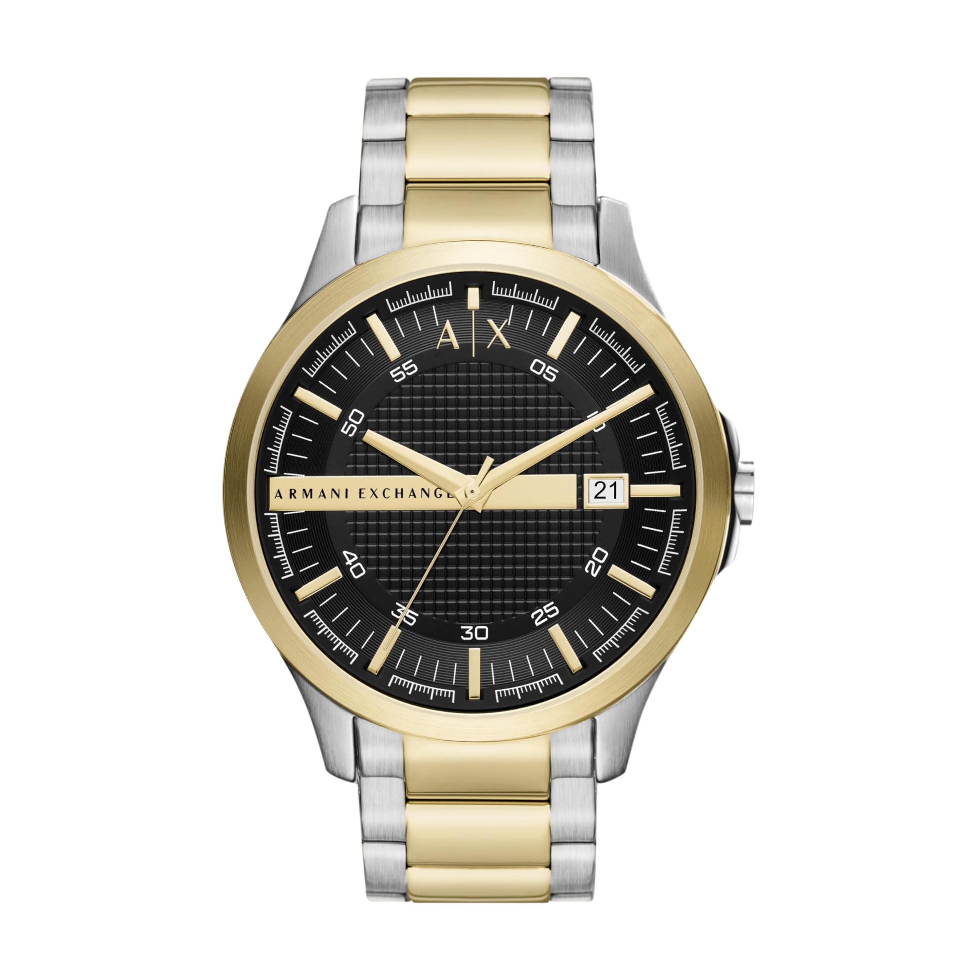 - Armani Exchange's 46mm watch features a black textured dial, three-hand date movement and two-tone stainless steel bracelet.