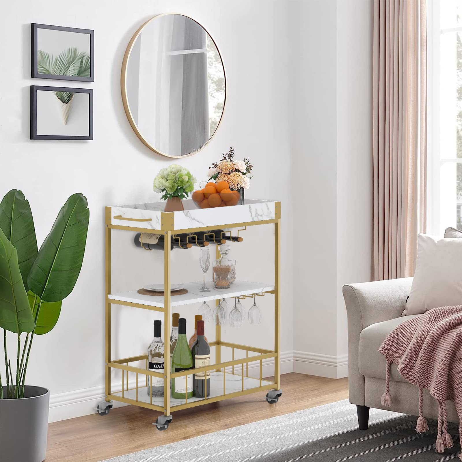- 【MULTI FUNCTION】This golden bar cart can not only serve as a kitchen service cart, microwave rack cart, beverage cart at parties, but also serve as a wine cart or coffee cart for hotels. With its convenient and versatile design, this mobile tool car will be a good assistant for various gatherings and household storage.