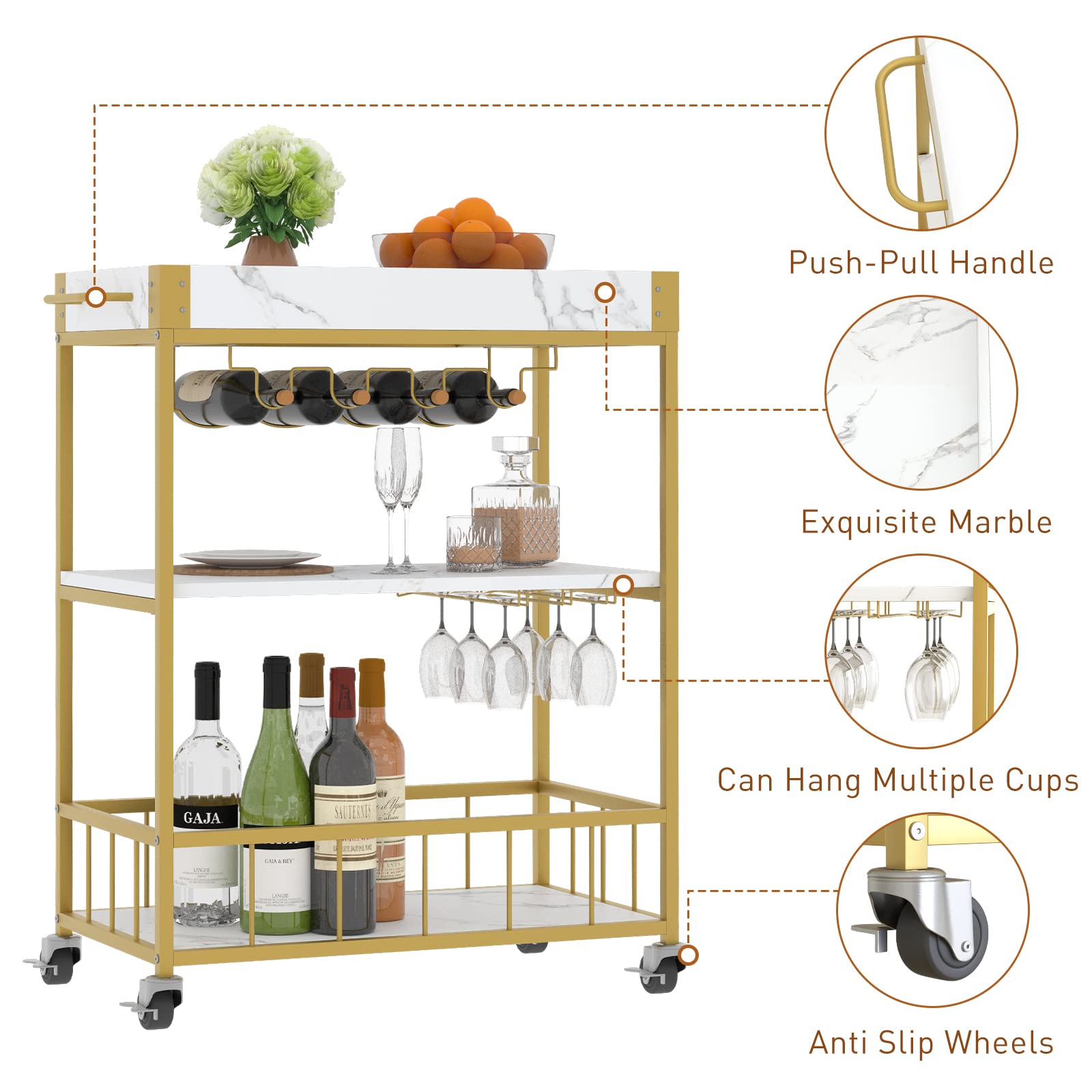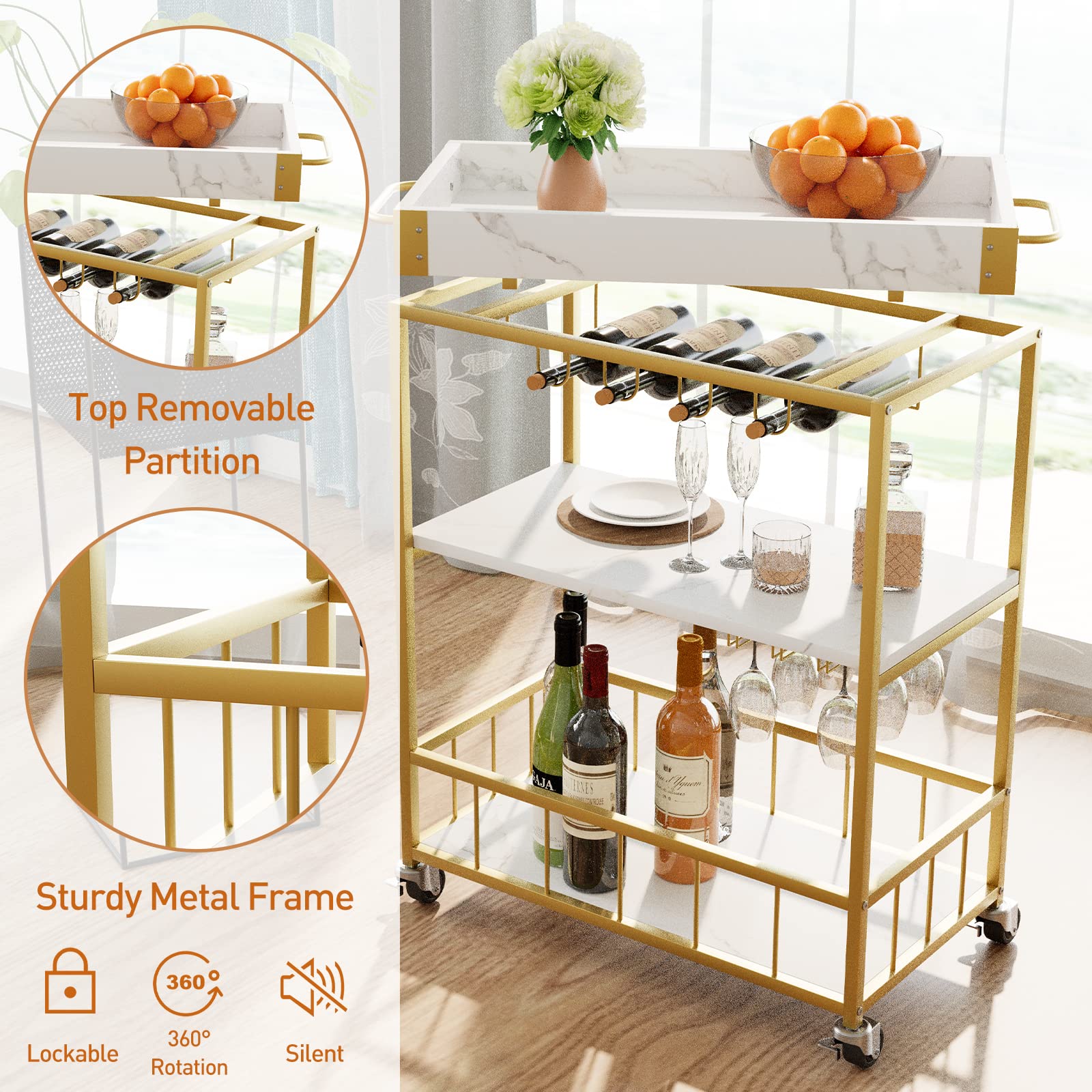 Details: Aboxoo Bar Cart 3 Tiers Removable Storage Tray With Wine Rack & Wine Glasses Holder,Rolling Beverage Cart,Mobile Bar Serving Cart With Handle , White Marble Wood And Gold Steels Home Kitchen Shelf For Party