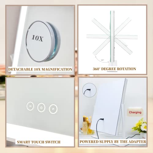 - 🔍【 Detachable 10X Magnifying Mirror 】The makeup mirror with lights has a detachable 10x magnifying mirror to help applying mascara, eyeliner, eyebrow and lipstick, And it can enlarge the blemishes on the face and make better retouching.Let you present the most perfect state, suitable for the pursuit of exquisite you.