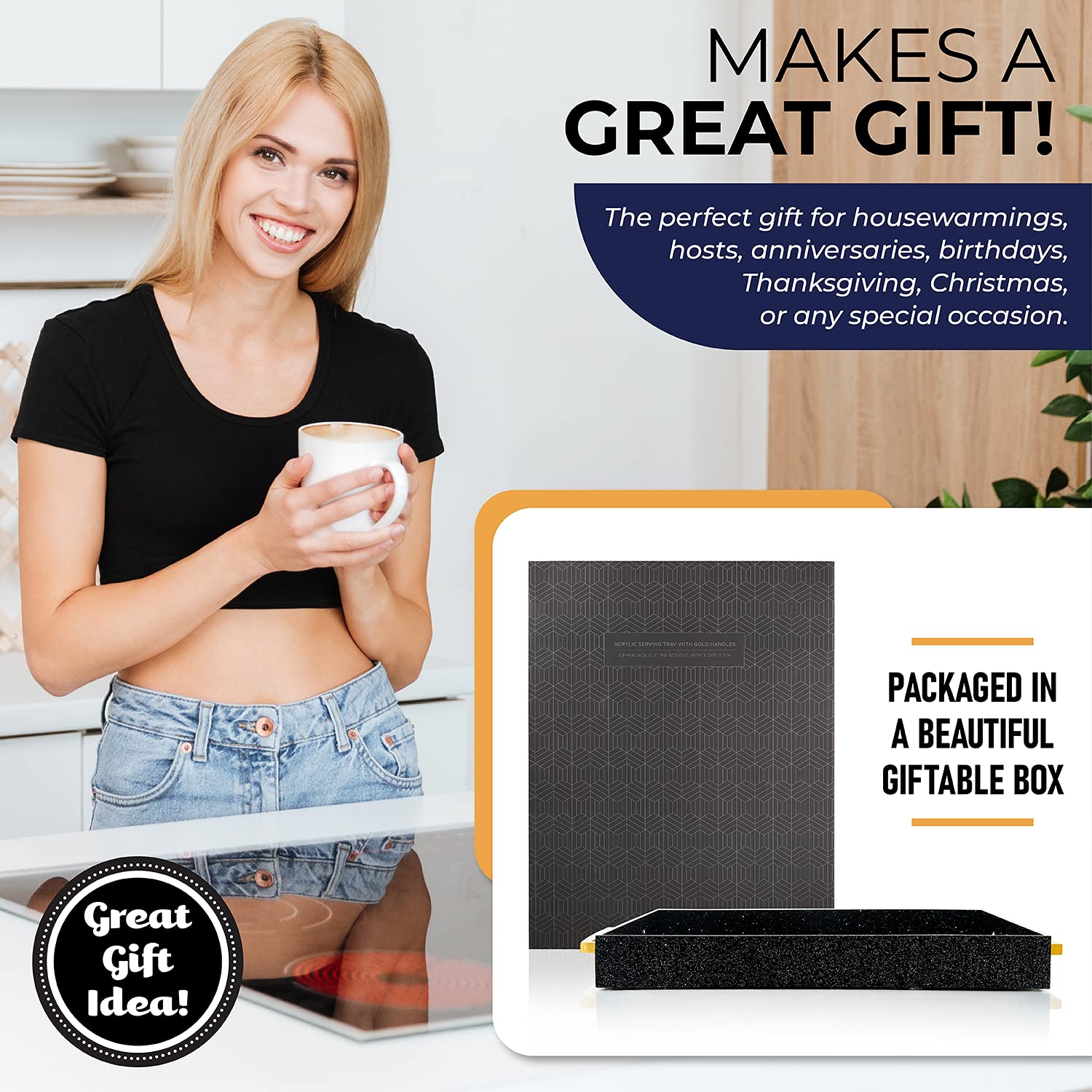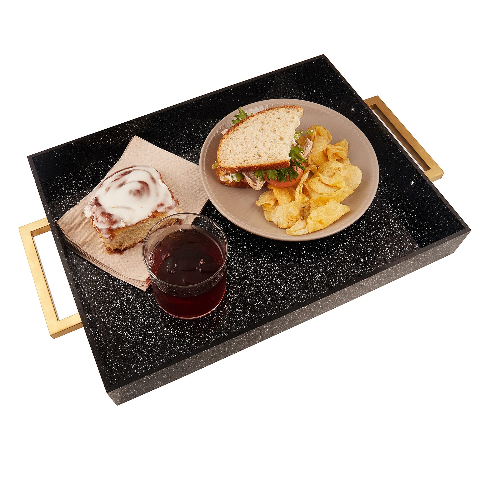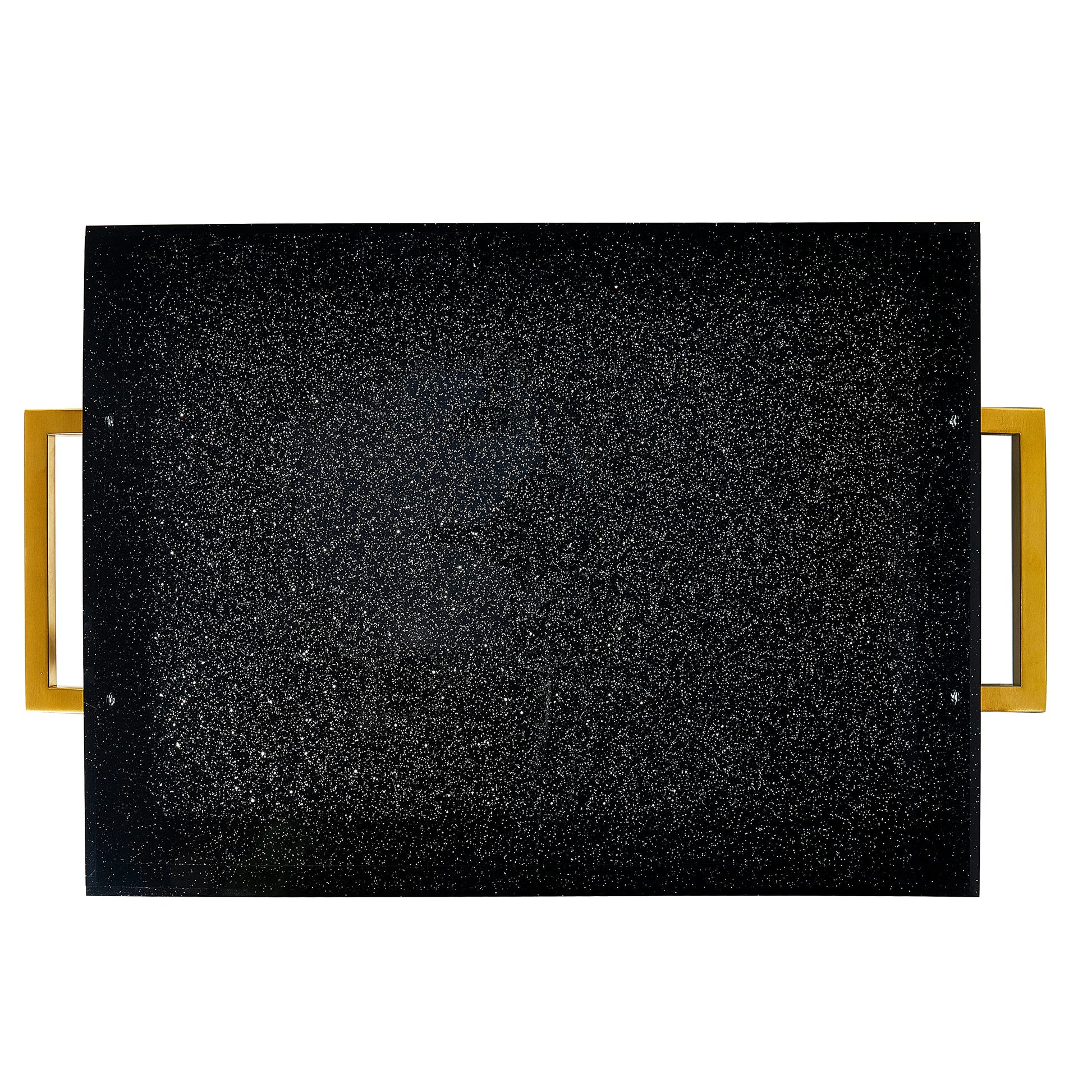 Acrylic Serving Tray with Gold Handles, 16" x 12" Decorative Trays for Coffee Table, Spill Proof Food Drinks Server, Ottoman Tray for Countertop, Kitchen, Vanity, Serving Party Platter (Black Glitter)