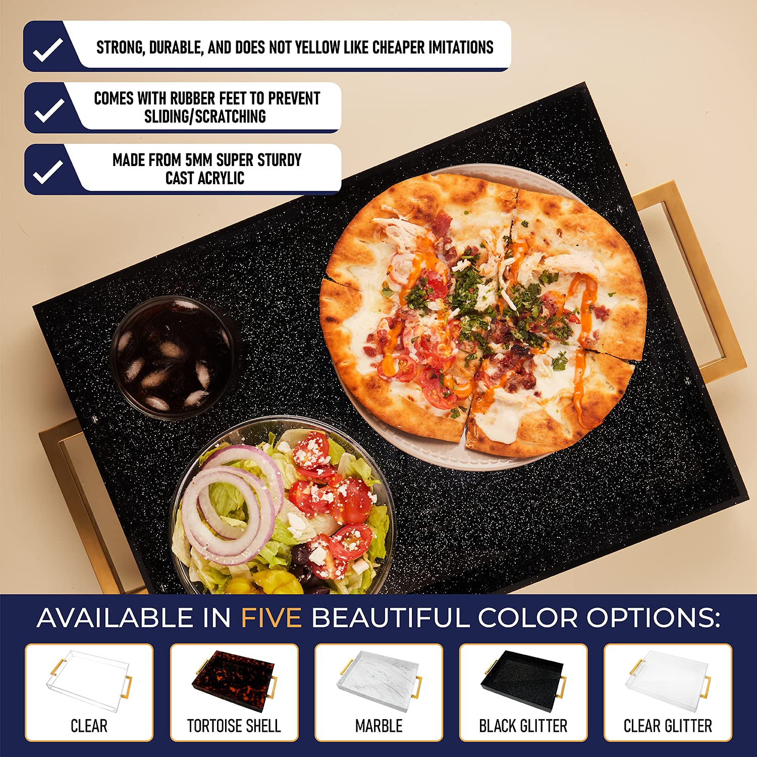 - Acrylic Tray with Handles - Contemporary serving tray with gold handles included. Available in five beautiful color options (clear, tortoise shell, marble, black glitter, and clear glitter). Product dimensions: 16" x 12" x 2" (not including the handles)