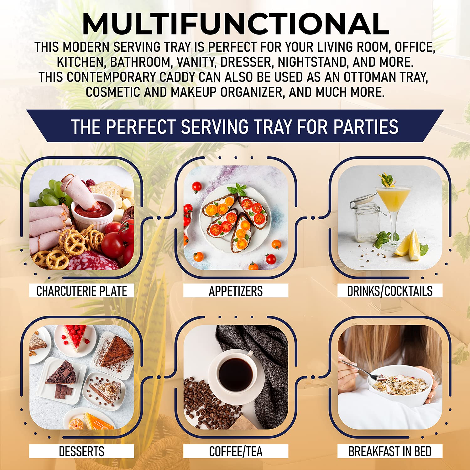 - Multifunctional - This modern serving tray is perfect for your home, office, kitchen, bathroom, vanity, dresser, and nightstand. This contemporary caddy can be used as a breakfast tray, cosmetic and makeup organizer, serving drinks or deserts, and much more.