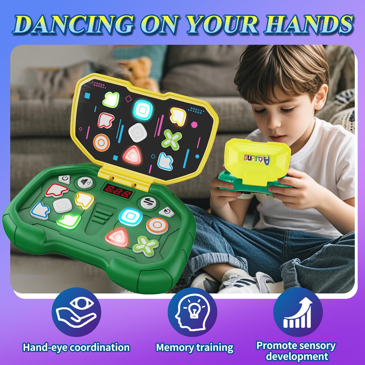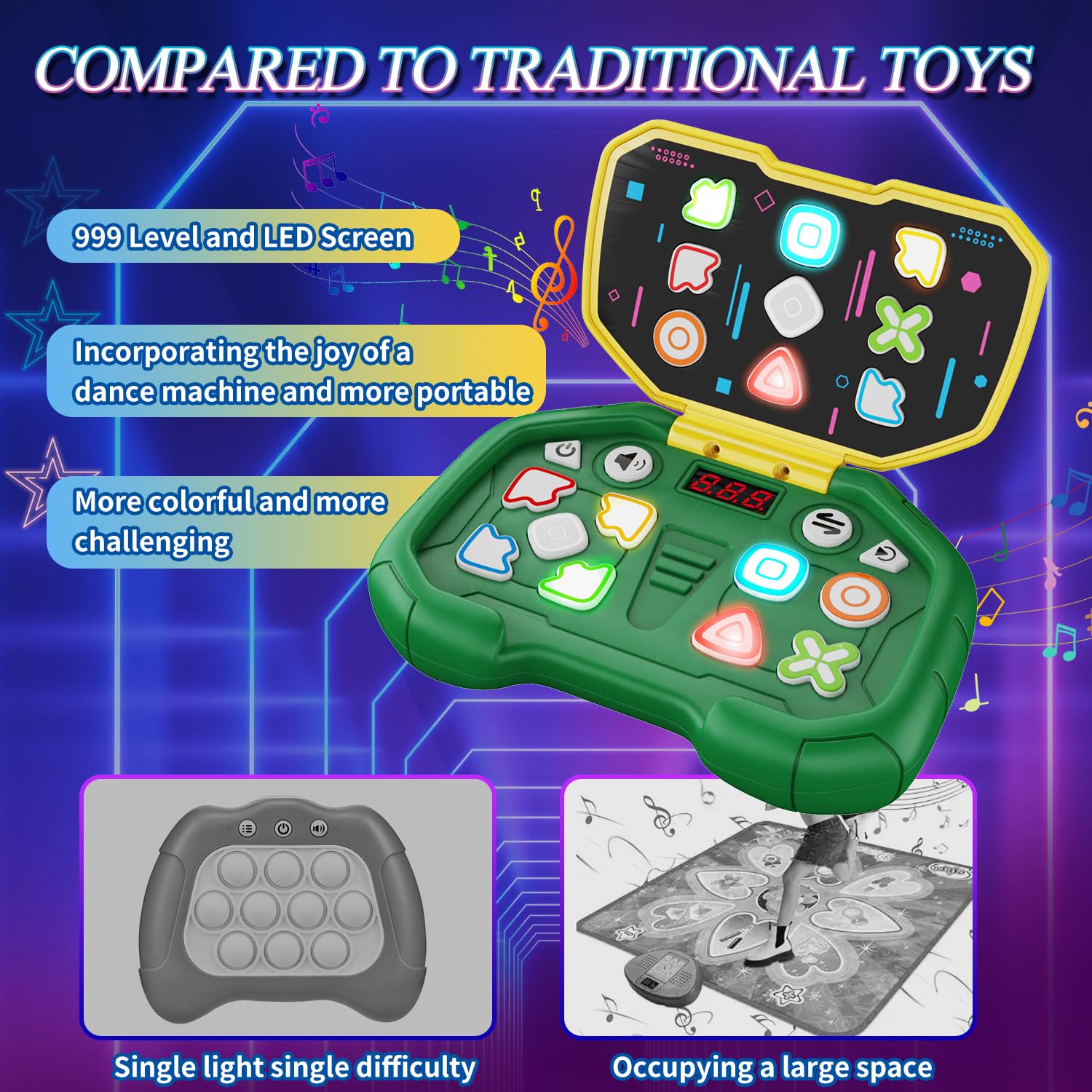 - Get ready to experience the ultimate combination of fast push game and the classic dance game—now enhanced with colorful lights, dynamic music, 999 levels, and real-time LED score tracking. and a captivating sensory experience, this game promotes hand-eye coordination, memory training, and reduces screen time for kids.