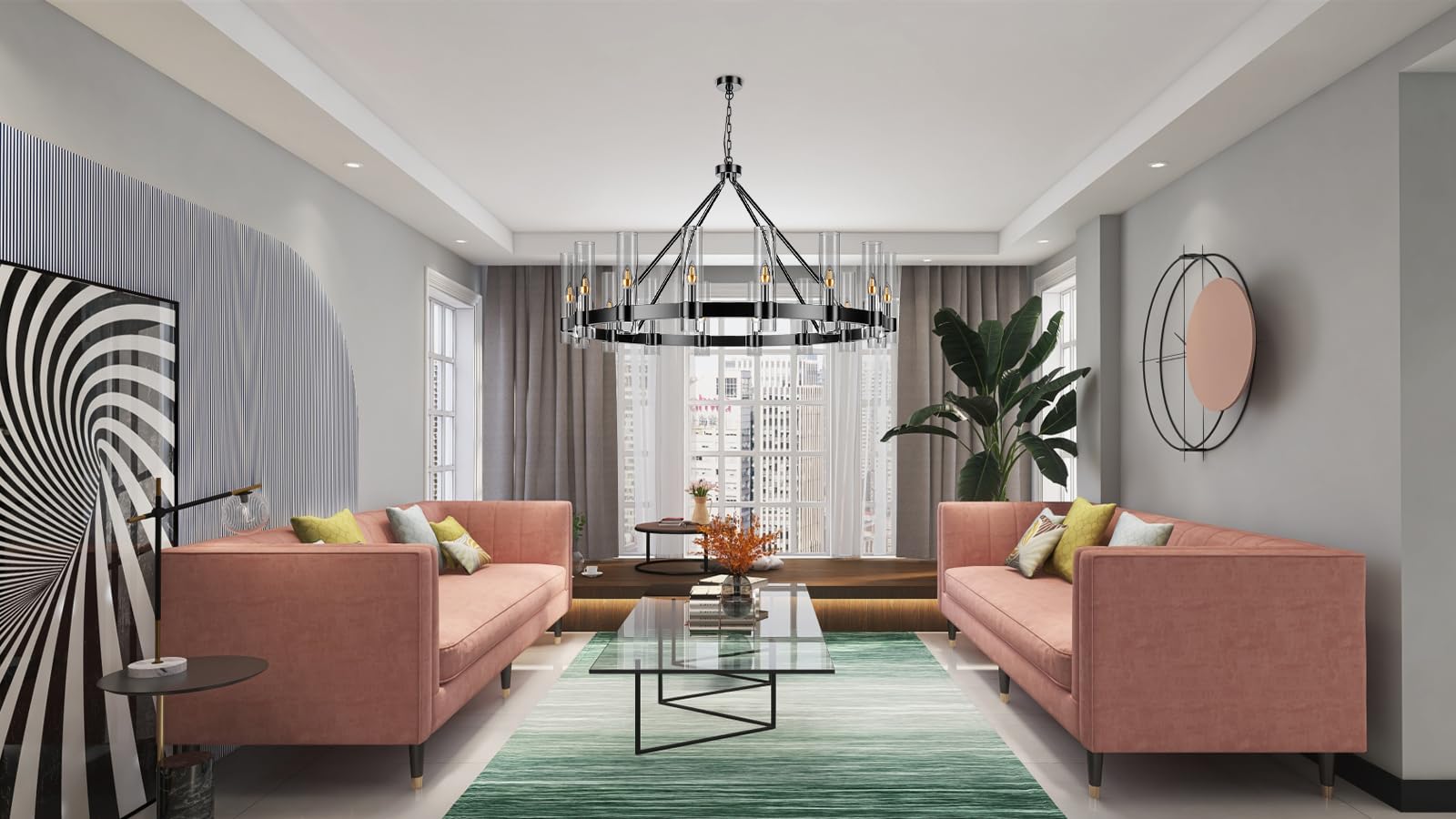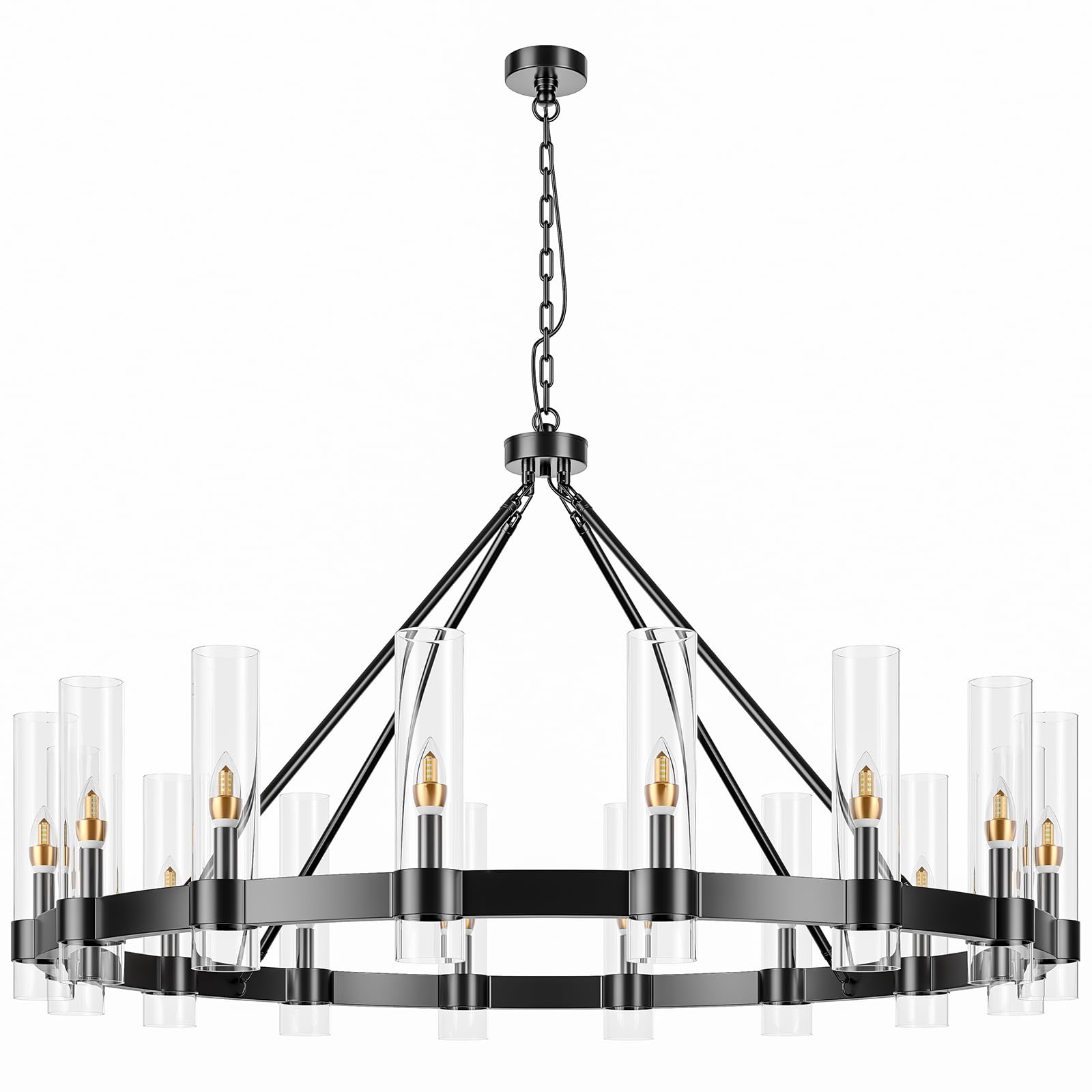 - 【Farmhouse Wagon Wheel Chandeliers】: Our this classic and elegant matte black finishes wagon wheel chandelier ( with clear glass shade ) is carefully designed to make it blend into the home environment by professional designers. Every part of the lamp body is created by the precise cutting of machinery and the ingenuity of human craftsmanship. The distinctive and eye-catching design of wagon wheel pendant lighting makes them an ideal centerpiece for any room.