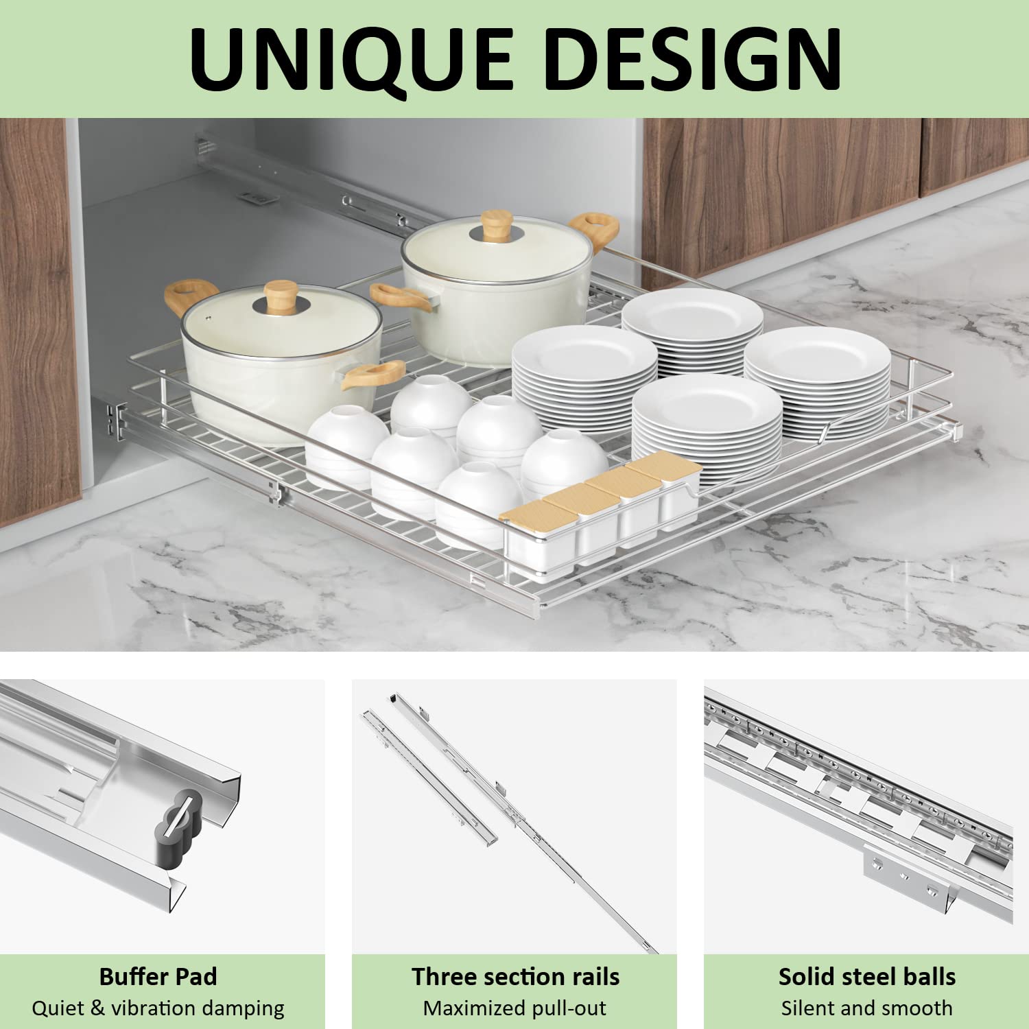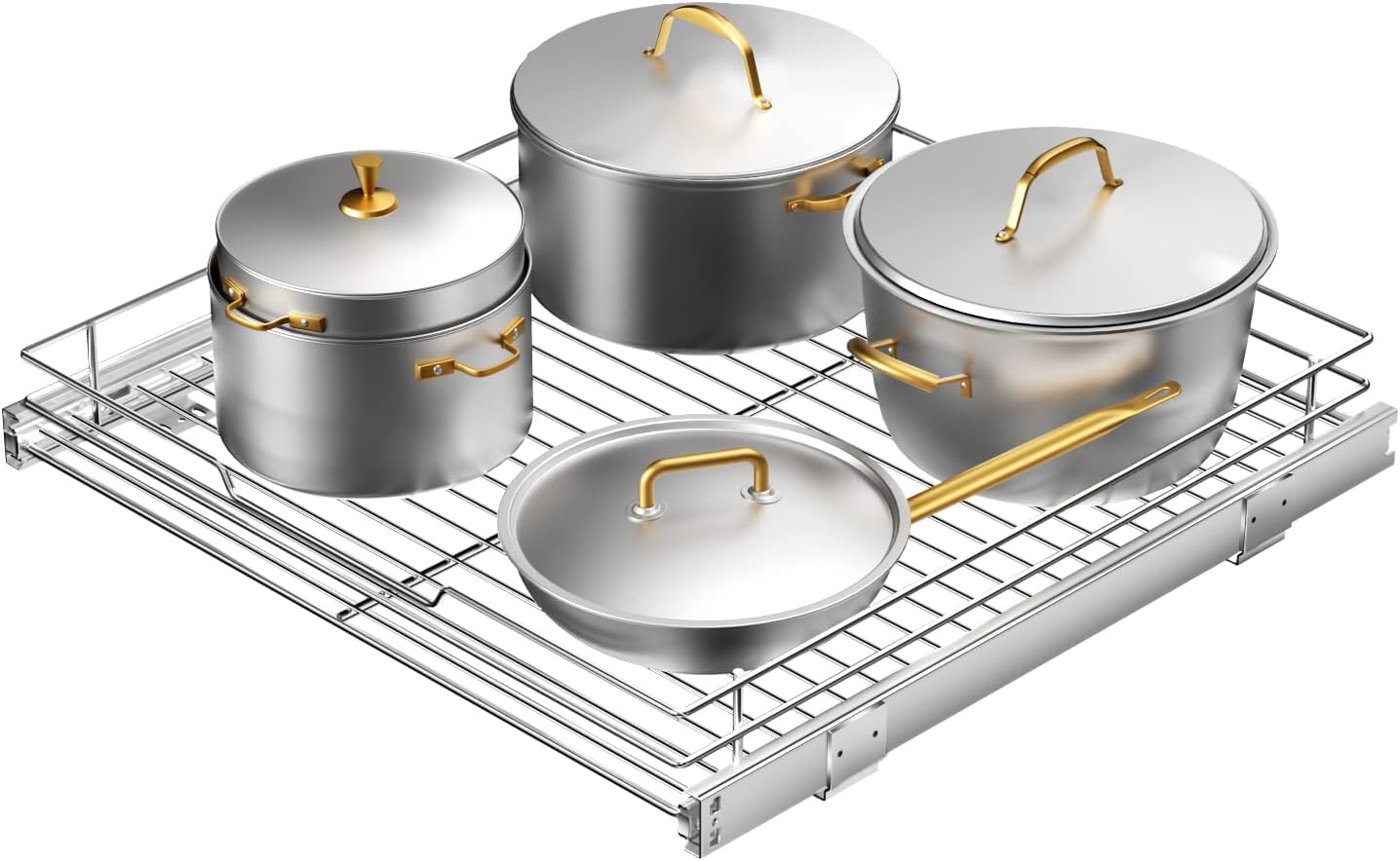 - đ¸ăDURABLE & STURDY MATERIALăOur cabinet pull out shelves are made of extremely hard chrome-plated metal, which are durable, rust-resistant and highly wear-resistant due to their unique composition. After several weight-bearing experiments, cabinet pull out shelves can ensure that they can still be smooth and silent when pulled out. So you don't have to worry about their load-bearing capacities! And their smooth, even glossy appearance can be well adapted to various styles of places.