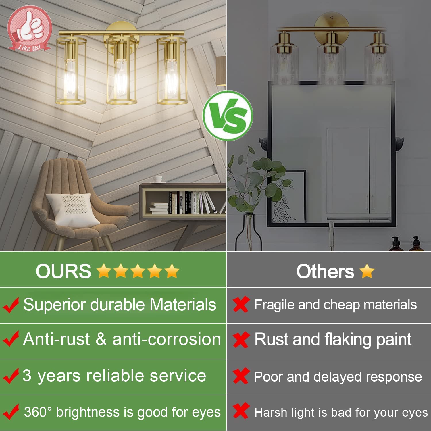 - ❤️【Superior Durable Material】―This gold bathroom light fixture uses premium metal with brushed gold baking varnish which is anti-rust and anti-corrosion. High-quality metal material allows you to use years without any worries. The thick metal makes the brass wall sconce holder dustproof and waterproof, so it can apply to the bathroom, laundry room, powder room, and more.