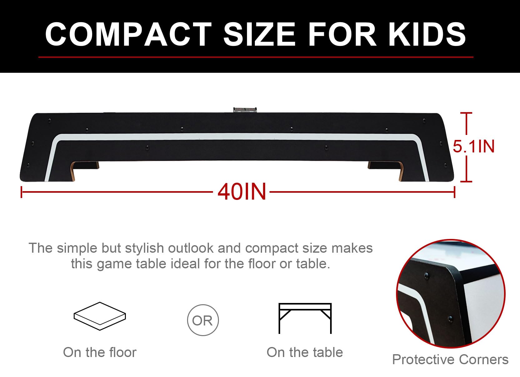 - 40-Inch Air Hockey Table for Kids and Adults, this kids table games overall dimension is 40” L x 20” W x 5” H, which is suitable for floor, carpet, tabletop, or other flat surface playing.