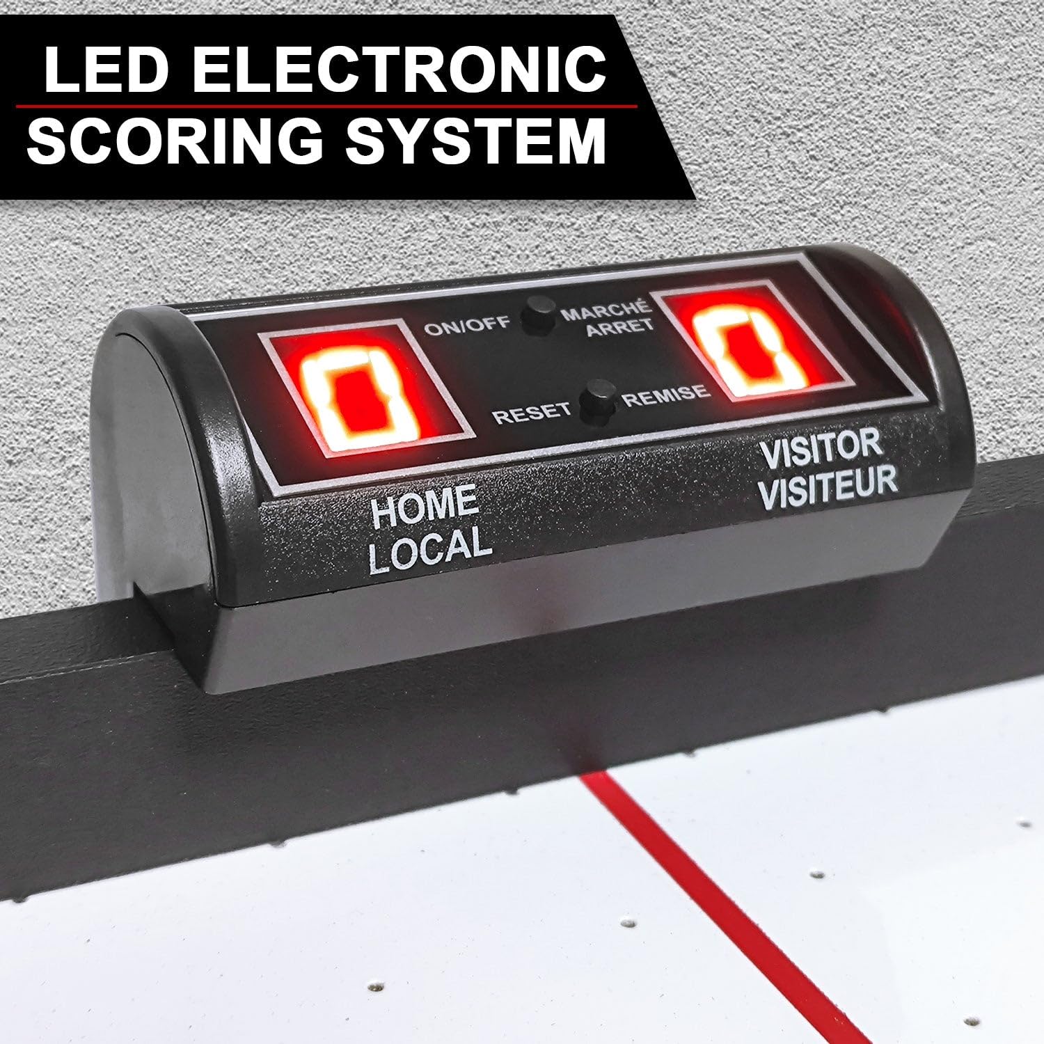- No Assembly Needed and Complete Electric-powered Air Table Set: This table game for kids includes LED and Manual Scoring system, 2 strikers and pucks, powder adapter, you just simply attach the scorer system and the adapter on the fan then the game is ready to play!